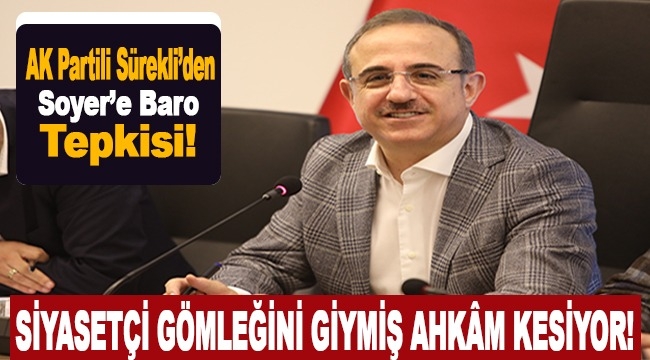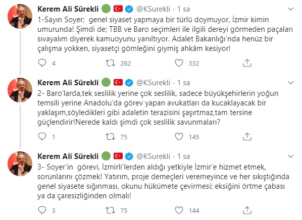 “Sayın Soyer; genel siyaset yapmaya bir türlü doymuyor, İzmir kimin umurunda! Şimdi de; TBB ve baro seçimleri ile ilgili dereyi görmeden paçaları sıvayalım diyerek kamuoyunu yanıltıyor. Adalet Bakanlığı’nda henüz bir çalışma yokken, siyasetçi gömleğini giymiş ahkâm kesiyor!