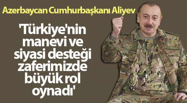 Bu bayramın tüm Azerbaycan ve dünyadaki tüm Azerbaycanlılar tarafından kutlandığını kaydeden Aliyev, “Biz tarihi anlar yaşıyoruz. Sokaklarda herkesin bu bayramı nasıl kutladığını görüyorsunuz. Bu bayram bizde olduğu gibi kardeş Türkiye'de de kutlanıyor. Bu çok doğal. Çünkü biz tek millet, iki devletiz. Bugünler içinde aziz kardeşim, Türkiye Cumhurbaşkanı Recep Tayyip Erdoğan'a defalarca teşekkürlerimi ilettim. Dün de telefonda konuştuk. Kendisine bir kez daha teşekkür ettim. Bu zaferin kazanılmasında Türkiye'nin siyasi ve manevi desteği büyük rol oynadı. Zira Cumhurbaşkanı'nın, kardeşimin ilk saatlerden itibaren söylediği 'Azerbaycan yalnız değil, Türkiye onun yanındadır' sözleri, çoğunun bu ihtilafa müdahale girişimlerini alt üst etti. Bu süre zarfında hem Cumhurbaşkanı hem de bakanlar ve üst düzey yetkililer bize her zaman desteklerini ifade ettiler. Gördüğünüz gibi, neredeyse her hafta Türkiye'den birkaç heyet geliyor. Türkiye'nin bize gösterdiği destek ve dayanışma Azerbaycan halkı tarafından büyük takdir görmektedir” diye konuştu.