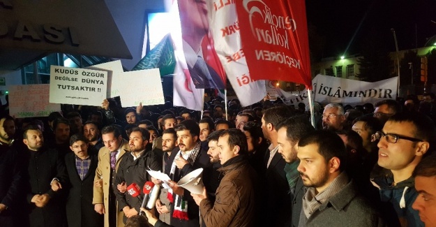 Başkent’te, Amerika Birleşik Devletleri (ABD) Büyükelçiliği önünde toplanan grup, Kudüs’ün İsrail’in başkenti olarak tanınmasını protesto etti. Grup adına yapılan açıklamada, “Hadsizliğin, saldırganlığın ve hukuksuzluğun geldiği son nokta olarak, Siyonizmin bu devirdeki kullanışlı piyonu Trump aracılığıyla, ilk kıblemiz Kudüs’ümüzü işgalci İsraillilerin Siyonist emelleri doğrultusunda başkent ilan etme cüretinde bulunmuşlardır” denildi.ABD Başkanı Donald Trump’ın, Kudüs’ü İsrail’in başkenti olarak tanıma kararını protesto eden çok sayıda sivil toplum kuruluşu üyesi, akşam saatlerinde ABD Büyükelçiliği önünde toplandı. ABD ve İsrail aleyhine dövizler taşıyan grup üyeleri, “Katil İsrail, işbirlikçi ABD”, “Kudüs evimiz, kırmızı çizgimiz”, “Katil İsrail, Filistin’den defol” şeklinde sloganlar attı. Eylem sırasında, çok sayıda polis güvenlik önlemi aldı.Ankara Gençlik Sivil Toplum Kuruluşları Platformu adına basın açıklaması yapan Ali Osman Özdemir, “Bir yandan gönül coğrafyamıza ölümler yağdırılırken; bir yandan da kutsallarımız çiğnenip, topraklarımıza el uzatılmaktadır. Hadsizliğin, saldırganlığın ve hukuksuzluğun geldiği son nokta olarak, Siyonizmin bu devirdeki kullanışlı piyonu Trump aracılığıyla ilk kıblemiz Kudüs’ümüzü işgalci İsraillilerin Siyonist emelleri doğrultusunda başkent ilan etme cüretinde bulunmuşlardır. İlk kıblemizin bulunduğu Filistin 1948 yılından beri yüzlerce yıllık Büyük İsrail Projesi çerçevesinde adım adım işgal altına alınmıştır. TV’lerde naklen Müslüman semtleri bombalanırken, masum kadınları, erkekleri, çocukları dünyanın gözü önünde cami avlusunda katledilirken, bunu yapan işgalci güruhu şımarıklıkla sınıflandırıp, şirin göstermeyi alçaklık olarak nitelendiriyoruz” diye konuştu.“İslam’ın ilk kıblesinde dahi ezanı Muhammedi’nin yasaklanması, son olarak da Kudüs’ün işgalci Siyonistlerin başkenti olarak ilan edilmesi cüretinde bulunmuş bir eşkıya ordusuna karşı dik duruşun bir Müslüman için namus meselesi olduğunu tüm İslam alemine hatırlatıyoruz” diyen Özdemir, şöyle devam etti:“Alemi İslam’ı reel politik kaygılardan arınarak Amerika’dan, İsrail’den değil Allah’tan korkmaya ve ona teslim olmaya çağırıyoruz. Artık ümmetin prangalarından kurtulması ile Filistin’in özgürlüğe kavuşması aynı çizgiye gelmiştir. İslam coğrafyası üzerinde yeni üretilen silahların tatbikatının yapılmasına göz yuman, kimseye hesap verme gereği duymadan çocukları öldürülen, kadınlarının namuslarına tecavüz edilen, ilk kıblesine el uzatılan İslam dünyasının mensuplarına sesleniyoruz; daha neyi bekliyorsunuz? Daha ne kadar kendi kardeşlerinize, ümmetin meselelerine sağır, dilsiz kalacak, görmezden geleceksiniz? Filistin, dar bir coğrafyada bulunan bir takım insanların meselesi değil, tüm İslam aleminin namusudur. Celladından, diz çöküp af dileme gafletinden kurtulunuz. Dünya var oldukça yeryüzü bizimdir. Kudüs bizimdir.”Özdemir’in basın açıklaması, sık sık sloganlarla bölündü. Grup, açıklamanın ardından olaysız şekilde dağıldı.