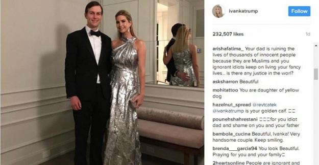 ABD’de Kasım ayında yapılan Başkanlık seçimlerinin galibi Donald Trump ve ailesi seçimlerin yapıldığı günden beri eleştiri oklarının hedefinde. “Bizim başkanımız değilsin” sloganlarıyla günlerce sokakları dolduran protestocular, Trump’ın 20 Ocak’taki yemin töreni esnasında da sessiz kalmamıştı. Trump’ın Cuma günü göçmen yasağını imzalaması yaşanan gerilimi bir kez daha tırmandırdı. Vizeleri ve yeşil kartları olmasına rağmen ülkeye alınmayan bazı turistlerin gözaltına alınmasının ardından binlerce kişi havalimanlarında koştu. Trump karşıtı sloganlar atan kalabalık yeni başkanlarını protesto etti.Yaşanan gelişmelerde bu kez eleştirilerin hedefi Trump’ın kızı Ivanka Trump oldu. Sosyal medya hesaplarından eşi ile katıldığı galadan fotoğraf paylaşan Ivanka, Amerikan halkının sert ifadeleriyle karşılaştı. Twitter kullanıcıları İvanka’nın fotoğrafının altına, “Binlerce aile babanız yüzünden parçalandı. Ancak hoş elbise. Partide iyi eğlenceler”, “Şaka yapıyor olmalısın”, “Ülkemizin temsil ettiği değerlere ihanet edilirken Trump’ın kızının gecesinin eğlenceli geçmesinden memnunuz” yorumları bırakıldı.Aynı fotoğrafı Instagram hesabında da paylaşan Ivanka bu kez daha sert eleştirilerle karşılaştı. Sosyal medya kullanıcıları, Ivanka Trump’ın fotoğrafına, “Kek yemesine izin verin” , “Utan, utan, utan”, “Baban Müslüman oldukları için binlerce masum insanın hayatını mahvediyor ve siz cahil aptallar süslü hayatınıza devam ediyorsunuz. Adalet mi?”, “Baban Amerika’yı bölüyor. Amerika, babandan önce daha iyiydi. Ticaretle uğraşmalı, siyasetle değil. Para, merhameti satın alamaz” yorumları yapıldı.