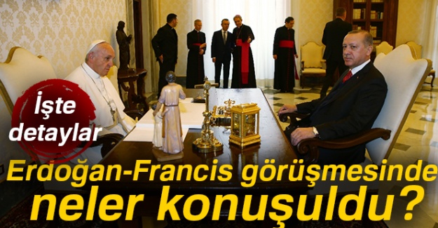 Cumhurbaşkanı Recep Tayyip Erdoğan ile Papa Francis arasındaki görüşmenin son derece dostane bir havada geçtiği öğrenildi.Cumhurbaşkanlığı kaynaklarından edinilen bilgiye göre, Vatikan’daki gelenek doğrultusunda Apostolik Kütüphene’de gerçekleşen baş başa görüşmede, Kudüs, mülteciler, başta Suriye olmak üzere Ortadoğu’daki gelişmeler, terör, farklı dinlerin mensupları arasındaki ilişkiler hakkında görüş alışverişinde bulunuldu. Cumhurbaşkanı Erdoğan ve Papa Francis, Müslümanlar, Hristiyanlar ve Yahudiler tarafından kutsal addedilen Kudüs’ün BM kararları ve uluslararası hukuk tarafından belirlenmiş statüsünün muhafaza edilmesi gerektiğini vurguladılar. Görüşmede, ABD Yönetimi’ne Kudüs’le ilgili kararın sakıncaları ve uygulamaya geçirilmemesi yönünde telkinleri sürdürmenin önemine değinildi. Cumhurbaşkanı Erdoğan, Kudüs konusunda verdiği mesajlarından dolayı Papa’ya teşekkür etti. Papa Francis da Cumhurbaşkanı Erdoğan’a, Kudüs meselesiyle ilgili çabalarından ve mültecilere yönelik yardımlardan dolayı takdirlerini iletti. Cumhurbaşkanı Erdoğan, Türkiye’nin terörle mücadele kapsamında Suriye’de yaptığı operasyonlar hakkında da bilgi paylaşımında bulundu. Yabancı düşmanlığı ve İslamofobi ile ortak mücadeleye değinilen görüşmede, dinleri terörle ilintilendirmenin yanlış olduğu da vurgulandı. Bu çerçevede İslamı, terörle özdeşleştirmeye yönelik kışkırtıcı söylemlerden uzak durulması gerektiği belirtildi. Türkiye’de Katolikler dahil farklı inançlara mensup herkesin barış içerisinde bir arada yaşamalarına önem verdiklerini anlatan Cumhurbaşkanı Erdoğan, bu iradeyi somut olarak ortaya koyma adına son dönemde 14 kilise ve bir sinagogu onardıklarına dikkati çekti. Cumhurbaşkanı Erdoğan ve Papa Francis, bölgede barış ve istikrarın tesis edilmesi, yaşanan insani dramlara seyirci kalınmaması için uluslararası toplumu harekete geçirmesi hususlarında ortak adımlar atmanın mümkün olduğuna da işaret ettikleri görüşmede, gelecekte de temaslarını sürdürme konusunda mutabık kaldılar.Cumhurbaşkanı Erdoğan, Papa’yla görüşme akabinde, Vatikan Devlet Sekreteri (Başbakan) Kardinal Pietro Parolin’i kabul etti. Cumhurbaşkanı Erdoğan ve beraberindeki heyet daha sonra Vatikan’daki ünlü Aziz Petrus Bazilikası’nı ziyaret etti.