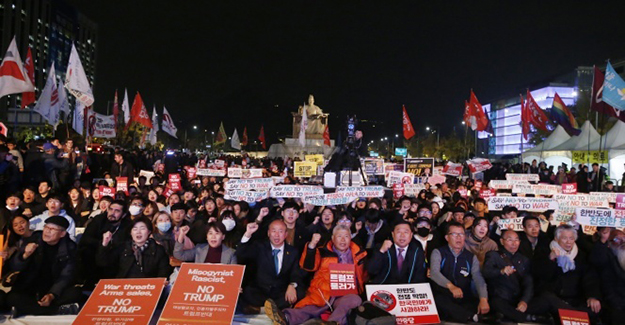 Asya turu kapsamında Güney Kore’ye ziyaret gerçekleştiren ABD Başkanı Donald Trump, Güney Kore ziyaretinin son gününde protesto edildi. Seul'de bulunan Ulusal Meclisin önünde Trump karşıtı ve yanlısı iki grup arasında çatışma yaşandı. Liberal ve muhafazakar gruplardan 8 bin 600 kişi Trump’ın açıklama yapmasından bir saat önce meclis yakınlarında toplandı. Meclis binasının yakınında polisten duvar ören 18 bin Güney Kore polisi, araçlarla birlikte güvenliği sağladı.Trump karşıtı göstericiler “Savaş yok” ve “Trump yok” şeklinde sloganlar atarak barışı yok ettiği ve insanlar arasında ırk ayrımcılığı yaptığı gerekçesiyle Trump’ı kınadı. Trump yanlısı göstericiler ise "Biz Trump'ı seviyoruz" şeklinde sloganlar atarak Güney Kore - Amerika ittifakının iyileştirilmesi çağrısında bulundu.