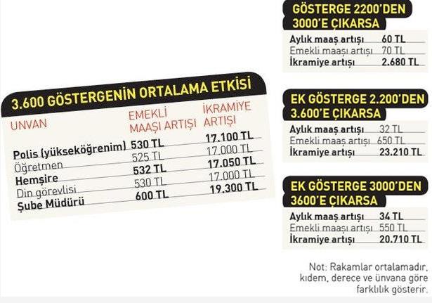 KIDEME GÖRE DEĞİŞİYORDördün biri derecedeki 25 yıllık 3000 göstergedeki bir memurun 77 bin liralık ikramiyesi 3600 ek göstergede 94 bin liraya çıkacak. 30 yıllık kıdemdeki memurda ikramiye 92 bin liradan 113 bin liraya yükselecek. Memurların kıdem süreleri ve derecelerine göre artışlar değişecek. Ancak ortalama rakamlara baktığımızda emekli maaşındaki artışların 500 lira, ikramiyedeki artışların da 17 bin lira civarında olacağı görülüyor.