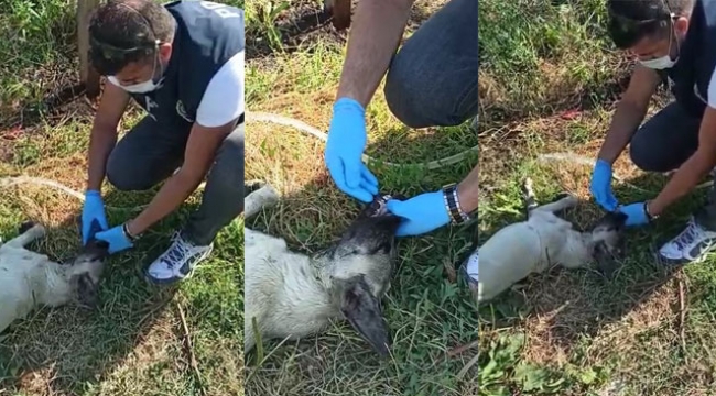 Bursa'da hayvan dostu bir polis memuru, susuzluk ve sıcaktan baygın düşen köpeğe elleriyle damla damla su içirdi. Güçlükle kendine gelen hayvan barınağa götürüldü.
