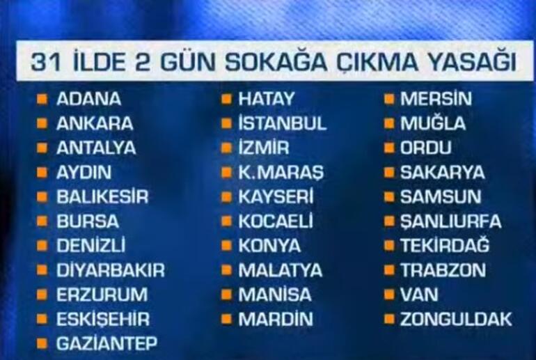 İçişleri Bakanlığı'ndan yapılan açıklamada, "10.04.2020 tarihi saat 24:00 ile 12.04.2020 tarihi saat 24:00 arasında Büyükşehir statüsündeki 30 ilimiz (Adana, Ankara, Antalya, Aydın, Balıkesir, Bursa, Denizli, Diyarbakır, Erzurum, Eskişehir, Gaziantep, Hatay, İstanbul, İzmir, Kahramanmaraş, Kayseri, Kocaeli, Konya, Malatya, Manisa, Mardin, Mersin, Muğla, Ordu, Sakarya, Samsun, Şanlıurfa, Tekirdağ, Trabzon, Van) ile Zonguldak il sınırları içinde bulunan tüm vatandaşlarımızın sokağa çıkmaları yasaklanmıştır. Saat 22.15 itibariyle valiliklere gönderilen genelgenin tüm detayları kamuoyu İle paylaşılacaktır" denildi.
