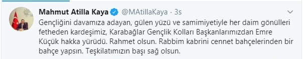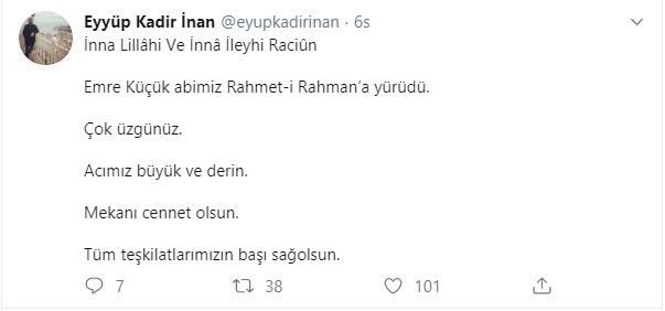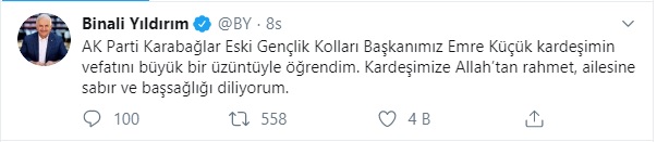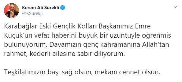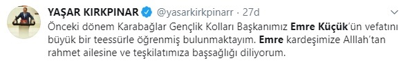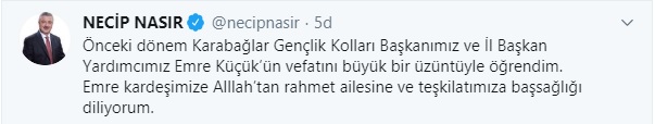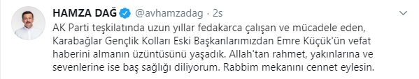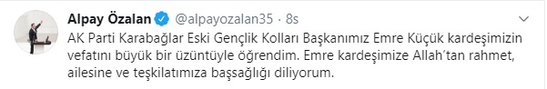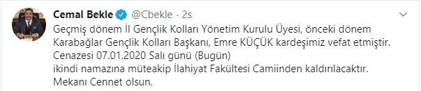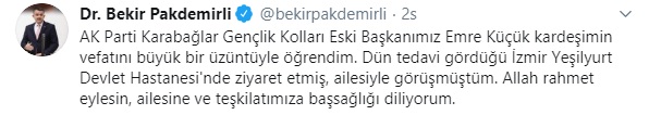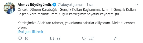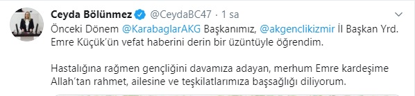 AK Parti Karabağlar Gençlik Kolları İlçe eski Başkanı Emre Küçük, uzun süredir mücadele ettiği kansere yenildi. Vefatı büyük üzüntü yaratan Küçük'ün cenazesi bugün ikindi namazına müteakiben İlahiyat Fakültesi Camisi'nden kaldırılacak.Emre Küçük'ün vefat haberi üzerine bir çok siyasetçi sosyal medyada başsağlığı mesajı yayınladı.