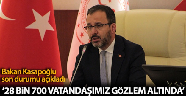 Gençlik ve Spor Bakanı Mehmet Muharrem Kasapoğlu, 76 ildeki yurtlarda 28 bin 700 vatandaşın karantinada olduğunu, 37 bin 468 vatandaşın ise evlerine uğurlandığını açıkladı.