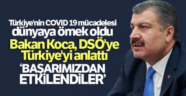 Bakan Koca ayrıca ABD'nin Türkiye'den tedavi protokollerini istediğini ve ABD Sağlık Bakanı Alex Azar “Nasıl yaptınız?” diye sorduğunu anlattı.Hürriyet gazetesinden Ahmet Hakan'ın sorularını yanıtlayan Sağlık Bakanı Fahrettin Koca, Dünya Sağlık Örgütü Başkanı Dr. Tedros Ghebreyesus başkanlığında iki saate yakın süren bir toplantıda 12 dakikalık bir sunum yaptığını belirterek, “Toplantıdan sonra ben sosyal medyada Türkçe, “Başarılarımızı anlattık, Türkiye'nin sunumu ilgi gördü” diye yazdım. Dünya Sağlık Örgütü Başkanı, bu mesajı takipçileriyle paylaşarak söylediğimize onay vermiş oldu. Bu kadar vakaya rağmen hastane yükümüzün bu kadar az olmasından etkilendiler. Zatürreye dönüşme oranının yüzde 64'ten yüzde 12'ye düşmesinden etkilendiler. Yoğun bakıma geçiş sayısının ve yoğun bakımda kalış süresinin azalmasından da etkilendiler. Mücadeledeki tedavi başarımızı anlattık. Erken dönemde bazı ilaçları stoklamamızı, bazı ilaçları Çin'den getirmemizi, bir tedavi protokolüyle tüm Türkiye'de aynı tedaviyi uygulamaya soktuğumuzu bu tedavi protokolünü sahadaki gözlemlerimize dayalı olarak yenilememizi anlattık" dedi.