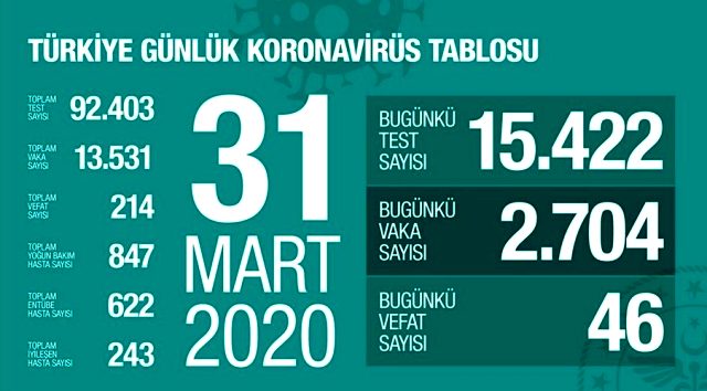 Sağlık Bakanı Fahrettin Koca, Türkiye'de yeni tip koronavirüs nedeniyle hayatını kaybedenlerin sayısı 214'e, toplam vaka sayısı ise 13 bin 531'e yükseldi.Bakan Koca, Twitter hesabından yaptığı açıklamada, Sağlık Bakanlığı'nın Türkiye'deki koronavirüs vaka ve ölü sayısı ile ilgili güncel verilerini paylaştı. Bakanlığın verilerine göre, son 24 saatte 15 bin 422 test yapıldı ve 2 bin 704 yeni tanı kondu, 46 kişi ise hayatını kaybetti.Açıklanan son rakamlarla birlikte Türkiye koronavirüs nedeniyle hayatını kaybedenlerin sayısı 214'e, toplam vaka sayısı ise 13 bin 531'e yükseldi.847 HASTA YOĞUN BAKIMDAFahrettin Koca'nın paylaştığı tablodaki verilere göre koronavirüs salgını nedeniyle ülkemizde 847 hasta yoğun bakımda tedavi görürken entübe hasta sayısı ise 622.İYİLEŞEN HASTA SAYISIBakanlığın açıkladığı verilerde sevindirici sayılarda var. Buna göre ülkemizdeki koronavirüs hastalarının 243'ü ise iyileşerek taburcu oldu.TOPLAM TEST SAYISI