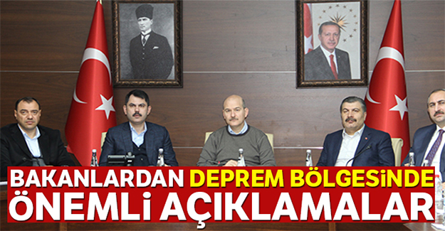 İçişleri, Sağlık,Çevre ve Spor Bakanı Elazığ'da son durumla ilgili açıklamalarda bulundu. İçişleri Bakanı Süleyman Soylu'nun açıklamalarından öne çıkanlar şöyle:"Yıkılan 58 binanın kira yardımı bugün hesaplarında olacak. Eşyasını alamayana 30 bin TL yardım verilecek. Yardım yapan vatandaşlarımızdan eski giysi gönderilmemesini istirham ediyoruz. Onları vermiyoruz, veremeyiz. Isıtıcı, battaniye göndermek isteyen varsa başımızın üzeridir.Koli içinde gıda göndermek isteyen varsa da başımızın üzeridir. Onun dışındaki her şeyi biz karşılıyoruz.Yardım yapan vatandaşlarımızdan eski giysi gönderilmemesini istirham ediyoruz. Onları vermiyoruz, veremeyiz. Isıtıcı, battaniye göndermek isteyen varsa başımızın üzeridir. Koli içinde gıda göndermek isteyen varsa da başımızın üzeridir. Onun dışındaki her şeyi biz karşılıyoruz. Elazığ içinde şimdiye kadar 10 bin çadır kurduk. Köylerimize 30 bin ton kömür yardımı yapıyoruz.SURİYELİ MAHMUD VE AİLESİ İÇİN VATANDAŞLIK İŞLEMLERİ BAŞLADISuriyeli vatandaşımız Mahmud ve ailesi için de vatandaşlık işlemleri başladı."Sağlık Bakanı Fahrettin Koca ise şunları söyledi:"Hastanelerde 70 yaralı var, 9'u yoğun bakımda. Yoğun bakımdaki hastalar arasında durumu kritik olan yok." Taburcu edilen hastaların evde bakım hizmeti sürüyor."Çevre ve Şehircilik Bakanı Murat Kurum'un açıklamaları ise şöyle:Arama kurtarma faaliyetlerimiz sona erdi. Hayatını tehlikeye atarak çalışan tüm ekiplerimize şükranlarımızı sunuyorum. 1000 kişilik ekiple hasar tespit çalışmalarını sürdürüyoruz. Dün itibariyle yıkım çalışmalarına başladık. İçinden eşya alabileceklerimiz var alamayacak durumda olan binalarımız var.ELAZIĞ'DA 58 MALATYA'DA 315 YIKIK BİNA TESPİT EDİLDİElazığ merkez, Sivrice ve Maden'de 428, Malatya Battalgazi, Doğanyol, Kale, Pötürge ve Yeşilyurt'ta 2 bin 424 ağır hasarlı binamız var. İki enkazımızın olduğu birincisi Sürsürü Mahallesi. Burada 10 bin 242 metrekarelik alanda 10 blokta toplam 200 daire yapacağız. Elazığ'da 58, Malatya'da 315 yıkık bina tespit edildi. Mustafa Paşa'da 300 konut projelendiriyoruz.Elazığ Yemişlik'te toplam 10 bin konutluk yeni bir uydu kent inşasını gerçekleştireceğiz. Yıkılan köylerde tarım köy uygulaması yapılacak.Gençlik ve Spor Bakanı Mehmet Muharrem Kasapoğlu'nun açıklamaları ise şöyle;Bu tür zor durumlarda milletimizin devletimizin ne kadar güçlü olduğunu tekrar görmüş olduk. Rabbim bundan sonra bizlere böyle acılar yaşatmasın. Ortaya konulan kardeşlik tablosu pek çok millet için örnek teşkil edecek bir tablodur. Spor camiamızın selamlarını getirdik.
