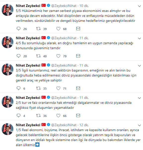 Ekonomi Bakanı Nihat Zeybekci, döviz piyasalarında yaşanan hareketlilikle ilgili değerlendirme yaptı.Twitter hesabından açıklama yapan Zeybekci şu ifadeleri kullandı: SAĞLIKSIZ FİYAT OLUŞUMLARI YAŞANMAKTADIR"Reel ekonomi, büyüme, ihracat, istihdam ve kapasite kullanım oranları, ayrıca gelecek beklentilerine ilişkin öncü gösterge olarak yatırım teşvik başvuruları ve dünyanın en iddialı teşvik sistemine olan ilgi ile dünyada bu bakımdan ilklerde yer alan ülkemiz kur ve faiz oranlarında hak etmediği dalgalanmalar ve döviz piyasasında sağlıksız fiyat oluşumları yaşamaktadır.EN UYGUN HAMLE EN DOĞU ZAMANDA...