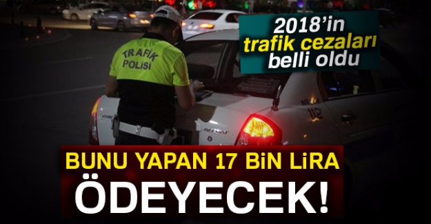 Trafik cezaları 1 Ocak 2018 tarihinden itibaren, Maliye Bakanlığınca belirlenen yeniden değerleme oranına göre yüzde 14,47 zamlı olacak.Buna göre, en düşük ceza 85,5 lira ile mevcut kapasitesi üzerinde yolcu alan ticari araç sürücülerine, en yüksek ceza ise 17 bin 65 lira ile yetkisi olmamasına rağmen plaka basanlar için kesilecek.Alkolmetreyi üflemeyi kabul etmeyene de 2 bin 858 lira ceza uygulanacak.