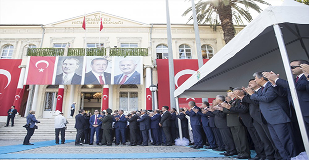 9 Eylül İzmir'in düşman işgalinden kurtuluş törenleri İzmir Valiliği önünde tarihi binaya bayrak çekiş ve atlı süvari birliklerinin gösterisiyle başladı.Bir grup "Recep Tayyip Erdoğan" tezahüratı yaptı ve tekbir getirdi, bir diğer grup ise "Mustafa Kemal'in askerleriyiz" ve "Türkiye laiktir laik kalacak" diye slogan attı.Gerginliğin artması üzerine iki grubun arasına çevik kuvvet girdi ve CHP'li milletvekilleri Mustafa Balbay ile Musa Çam'ın telkinleriyle ikinci grup dağıldı.Bu gruptan bayrak taşıyan yaşlı bir kadın meydanda kaldı ve sadece "İzmir" diye slogan attı.PROTOKOLDE GERİLİM YOKTUDün Selçuk'ta Başbakan Yıldırım'ın programını kürsüde konuşma yaptığı sırada protestolar sonrası terk eden Aziz Kocaoğlu da alana geldi. Kocaoğlu alana girdikten sonra protokolde yerini alırken Başbakan Yıldırım ile el sıkıştılar.