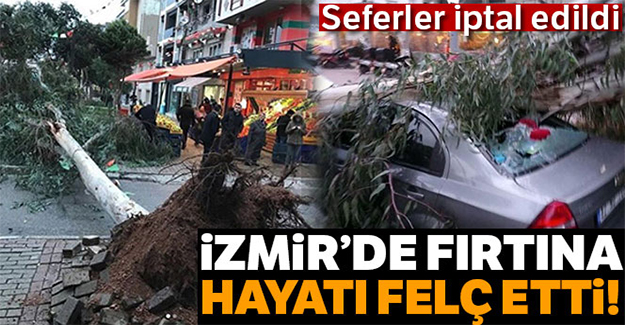 Meteoroloji Genel Müdürlüğünün İzmir'e fırtına uyarısının ardından İzmir'de fırtına etkili oldu. Saatte zaman zaman 90 kilometreye kadar etkili olan fırtına nedeniyle kentte adeta hayat felç oldu. Fırtına nedeniyle kentte onlarca ağaç devrildi. Rüzgar nedeniyle bazı evlerinde çatılarının uçtuğu bildiriliyor. Kentte rüzgar nedeniyle reklam panoları da devrildi. Saatteki hızı giderek artan fırtına nedeniyle bazı minarelerde zarar gördü.Seferler iptalÖte yandan, İZDENİZ'den yapılan açıklamada, 18.15 itibariyle olumsuz hava ve deniz koşulları sebebiyle arabalı vapur seferleri dahil tüm seferlerin geçici süre iptal edildiği duyuruldu.