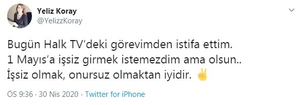 249 vatan evladının kanıyla yazılan 15 Temmuz destanıyla ilgili ’Yerim destanınızı’ başlıklı skandal köşe yazısıyla akıllara kazınan Yeliz Koray, sosyal medya hesabından, Halk TV'den istifa ettiğini duyurdu.Koray, "Bugün Halk TV’deki görevimden istifa ettim. 1 Mayıs’a işsiz girmek istemezdim ama olsun.. İşsiz olmak, onursuz olmaktan iyidir." ifadeleriyle duyurdu.İşte Yeliz Koray'ın o tweeti: