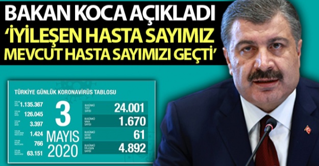 Sağlık Bakanlığı, 24 saatte bir güncellediği Türkiye'deki günlük korona virüs tablosunu açıkladı. Tabloya göre, bugün 24 bin 1 test yapılırken, bin 670 kişinin testi pozitif çıktı. Son 24 saatte korona virüs dolayısıyla 61 kişi hayatını kaybederken, 4 bin 892 kişi iyileşerek taburcu oldu. Bugünkü sayılarla beraber Türkiye genelinde toplam test sayısı 1 milyon 135 bin 367'ye, toplam vaka sayısı 126 bin 45'e, toplam vefat sayısı 3 bin 397'ye, toplam yoğun bakım hasta sayısı bin 424'e ve toplam iyileşen hasta sayısı 63 bin 151'e yükselirken, bir önceki gün 778 olan toplam entübe hasta sayısı 766'ya geriledi.Sağlık Bakanı Fahrettin Koca, yaptığı açıklamada, "11 Mart'tan bu yana ilk kez bugün, iyileşen hasta sayımız, mevcut korona virüs hasta sayımızı geçti. Tedbirlere uyuldukça, sonuç, çok daha iyi olacak" dedi.