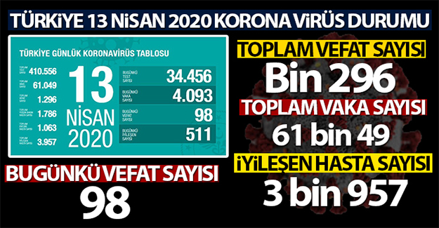 Sağlık Bakanlığı, son 24 saatte korona virüs nedeniyle 98 kişinin hayatını kaybettiğini, toplam can kaybının bin 296 olduğunu açıkladı.Sağlık Bakanlığı, son 24 saatte korona virüs nedeniyle 98 kişinin hayatını kaybettiğini, toplam can kaybının bin 296 olduğunu açıkladı. Açıklamaya göre bugün 34 bin 456 test yapılırken, 4 bin 93 yeni vaka tespit edildi. Toplam vaka sayısı 61 bin 49 olurken, toplam 3 bin 957 kişi iyileşti. Toplam entübe hastası bin 63 kişi, toplam yoğun bakım hastası bin 786 kişi oldu.Sağlık Bakanı Fahrettin Koca, Twitter hesabından yaptığı açıklamada, “Test sayımız yakında 500 bine ulaşacak. Artan test sayısına kıyasla beklenen vaka sayısındaki artış, hız olarak azalmaktadır. Erken tanı ve tedavi, iyileşen hasta sayımızı artırıyor” dedi.