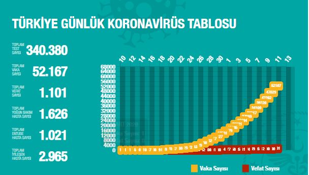 Sağlık Bakanlığı, son 24 saatte korona virüs nedeniyle 95 kişinin hayatını kaybettiğini, toplam can kaybının bin 101 olduğunu açıkladı. Açıklamaya göre bugün 33 bin 170 test yapılırken, 5 bin 138 yeni vaka oldu. Toplam vaka sayısı 52 bin 167'ye yükselirken, bugün iyileşen 542 kişi ile toplam iyileşen sayısı 2 bin 965 oldu.Sağlık Bakanı Fahrettin Koca, Twitter'dan yaptığı açıklamada, “Vaka sayımız, test sayısındaki artışla birlikte, öngörülebilir düzeyde artıyor. Bu artış, yoğun bakım sayısında gerçekleşmiyor. Tanıda daha hızlıyız, tedavi erken başlıyor. Türkiye tedavide ciddi başarı gösteriyor. Asıl başarı virüsten korunabilmekte” dedi.
