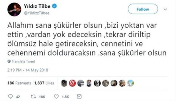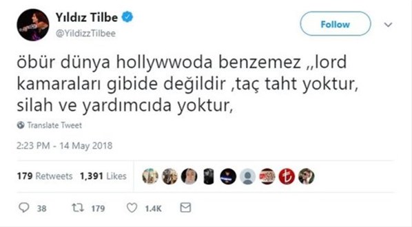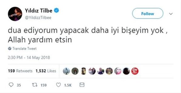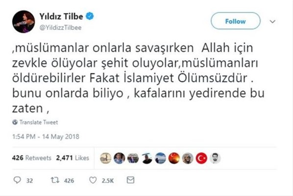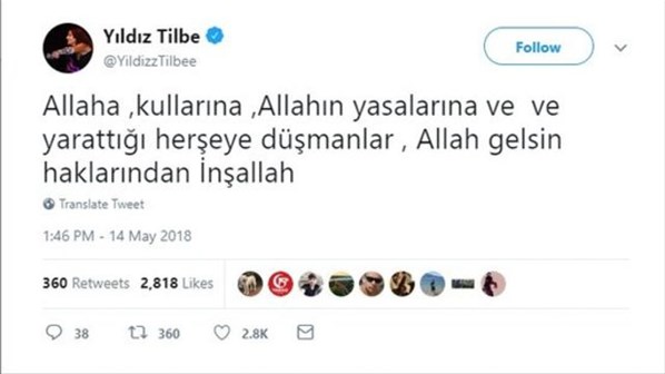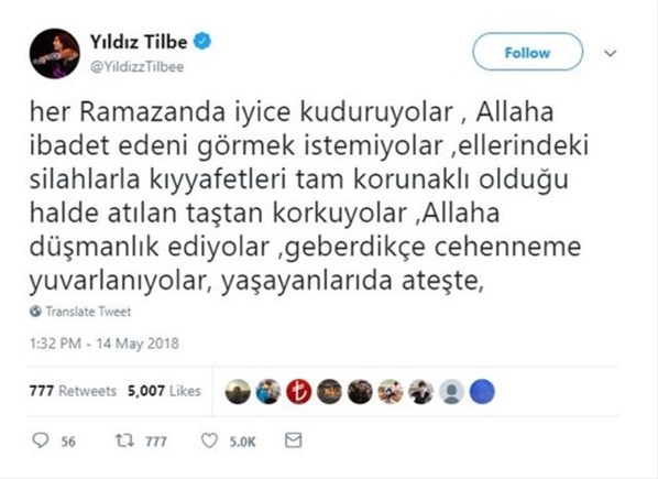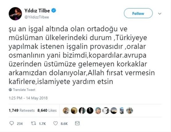 Yıldız Tilbe dün yaşananlara sosyal medya hesabından sert tepki gösterdi. "Şu an işgal altında olan Ortadoğu ve müslüman ülkelerindeki durum, Türkiye'ye yapılmak istenen işgalin provasıdır. Oralar Osmanlı'nın yani bizimdi, kopardılar. Avrupa üzerinden üstümüze gelemeyen korkaklar, arkamızdan dolanıyolar. Allah fırsat vermesin kafirlere, İslamiyete yardım etsin." sözleriyle tepkisini dile getiren Tilbe'nin paylaşımları şu şekilde: