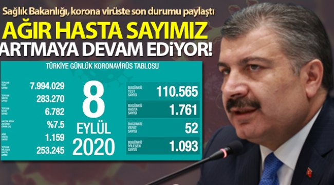 Sağlık Bakanlığının Covid-19 bilgilendirme sayfasında Türkiye'nin güncel korona virüs tablosu kamuoyuyla paylaşıldı. Tabloya göre son 24 saatte 52 kişi korona virüsten hayatını kaybetti, toplam can kaybı 6 bin 782'e yükseldi. Bugün toplam 110 bin 565 test yapılırken, bin 761 yeni vaka tanısı konuldu.Toplam vaka sayısı 283 bin 270 oldu. Bugün iyileşen bin 93 kişiyle birlikte toplam iyileşen toplam hasta sayısı 253 bin 245'e yükseldi. Toplam hastalarda zatürre oranının yüzde 7,5, toplam ağır hasta sayısının ise bin 159 olduğu açıklandı.“Ağır hasta sayımız artmaya devam ediyor”