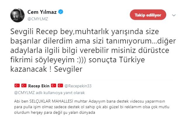 "PARA PULLA İŞİM OLMAZ BANA DESTEK OL ABİ"Mersin Selçuklar Mahallesi muhtar adayı Recep Ekin, sosyal medya platformu Twitter'da Cem Yılmaz'a, "Abi ben Selçuklar Mahallesi muhtar adayıyım. Bana destek videosu yapar mısın? Para pulla işim olmaz sadece destek ol sahip çık abi. Güzel bir reklamım olsa çok mutlu olurdum. Her şey para değil şu yalan dünyada" şeklinde ricada bulundu."BAŞARILAR DİLERİM AMA SİZİ TANIMIYORUM"Cem Yılmaz ise muhtar adayı Ekin'e "Sevgili Recep Bey, muhtarlık yarışında size başarılar dilerdim ama sizi tanımıyorum… Diğer adaylarla ilgili bilgi verebilir misiniz dürüstçe fikrimi söyleyeyim. Sonuçta Türkiye kazanacak! Sevgiler" yanıtını verdi.