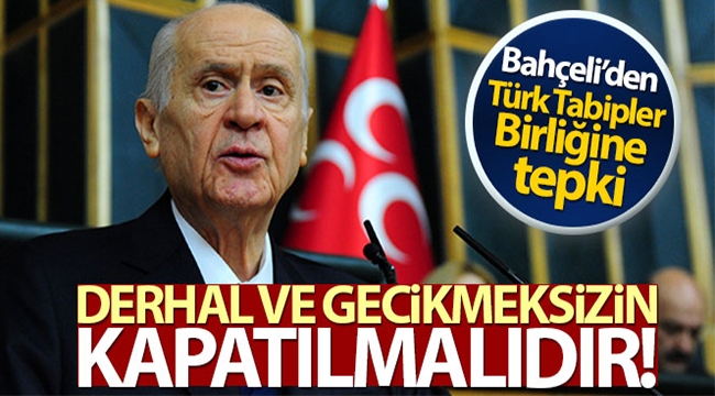 MHP Genel Başkanı Devlet Bahçeli, “Türk Tabipler Birliği, bugünkü hassas dönemde, insan ve toplum sağlığı hakkında asılsız şaibe ve şüpheleri körüklemektedir. Bu nedenle sadece adında Türk bulunan Tabipler Birliği derhal ve gecikmeksizin kapatılmalıdır” dedi.