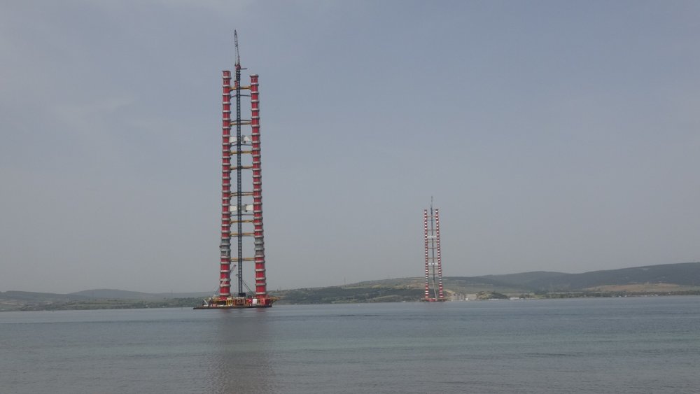 Erdoğan vatandaşların Ramazan ayını, Kadir gecesini ve 19 Mayıs Gençlik ve Spor Bayramı'nı tebrik ederken, köprünün çelik kulelerine yerleştirilecek son bloklar ve inşaatta emeği geçen eski bakanlarla, yüklenici firma ve tüm çalışanları tebrik etti.“Bu köprü tarihimize saygı duruşudur”Ulaştırma ve Altyapı Bakanı Adil Karaismailoğlu da bu vatan ve milletin dev projeleri hak ettiğini ifade ederek, “Tarihe tanıklık ediyoruz. Ülkemiz ve dünyanın en önemli projelerinden olan 1915 Çanakkale Köprüsü dünya birincisi kulelerinin çelik blok montajını yapıyoruz. 1915 köprümüz 101 kilometrelik Malkara Çanakkale otoyolunun gözbebeği ve kilit noktasında yer almaktadır. Bakanlığımız olarak 1 hafta önce metro hattının tünel bitim töreninde yerin altındaydık. Bugün ise 318 metre yükseklikte yeni bir başarıya imza atıyoruz. Bu proje ülkemizin geleceğe atılmış en önemli adımlarından biridir. Çanakkale Köprüsü iki yakayı buluşturan bir köprü olmaktan öte adeta tarihimize saygı duruşudur. 2023 yılına atıfta bulunan köprü tamamlandığında 2023 metre orta açıklığı ile sınıfında dünya lideri olacaktır. Dünyanın en yüksek kulesine sahip olacak köprünün 318 metre 3. ayın 18'ini gündem yaparak Deniz Zaferini temsil etmektedir. Biz 1915 Çanakkale savaşında yüzbinleri şehit vererek tüm dünyaya “Çanakkale geçilmez” dedik. Kahraman Seyit Onbaşı ile bugün Çanakkale köprü inşaatında çalışan kardeşlerimizin niyet ve samimiyetleri her türlü övgü üzerindedir. Dün bu topraklarda şehit olanlara ve bugün bölgenin kalkınması için gayret edenlere vefa borcudur. Bunu ödemek için var gücümüzle çalışmaya 2022 yılının 18 Mart'ında bitirmeye çalışıyoruz. Bugün köprümüzün çelik kule montajının son bloğunu monte ederken arkadaşlarımız adına şukranlarımı sunuyorum. 1915 Köprüsü tamamlandığında Lapseki Gelibolu arasındaki feribotla 1,5 saat süren ulaşım 6 dakikaya inecektir. Taşıt işletme giderleri ve ekonomik kayıplar ortadan kalkacak. Trafik sıkışıklığı azalacaktır. Kazalarla yaşanan can ve mal kaybı aza inecek kısa hizlı konforlu yolculuk tesis edilecektir. Yalnız Çanakkale'ye değil tüm Türkiye'ye değer katacak; ulaştırma sahnesinde yeni bir perde açacaktır. Trakya ve Ege bölgesini kıta avrupasıyla buluşturan köprü ticaret yollarını birbiriyle buluşturup ekonomiye canlılık sağlayacaktır. Çanakkale Köprüsü'nü içeren otoyol İstanbul Kırklareli, Edirne ve Tekirdağ'ı Ege'ye bağlayacak. 101 kilometre otoyol ile mevcut devlet yolu 40 kilometre kısalacak. 560 milyon lira yakıt ve zamandan tasarruf edilecektir “diye konuştu“1000'in üzerinde şantiyemizde önce sağlığa dikkat ediyoruz”Bakan Karaismailoğlu sözlerini şöyle sürdürdü: “Birbirini tamamlayan projelerle ülkemize yakışır dev eserler bırakmak istiyoruz. Engel tanımadan çalışmalarımıza devam ediyoruz. Tüm dünyayı etkileyen covid 19 tedbirlerimizi aldık. Çalışmalarımızı sürdürüyoruz. Ülke genelinde 1000'in üzernde şantiyelerde olduğu gibi önce sağlık, iş güvenliği ilkesine göre hareket ediyoruz. Pandemi süresine rağmen aldığımız tedbirlerle şantiyelerde çalışmalar aralıksız devam ediyor. Ulaşım ağını geliştirmek için var gücümüzle çalışıyoruz. İmkansız denileni gerçekleştirmenin ülkemiz için gurur, dünya için örnek projeler yapmanın sorumluluğunu taşıyoruz. Nice güzel işlere imza atacağmıza inanıyoruz”Limak Yatırım Yönetim Kurulu Başkanı Ebru Özdemir, verdikleri sözü tutacaklarını köprünün 2022 Mart ayında bitirileceğini kaydederek, “Dünyanın her tarafından 25 ülkeden banka bize d estek oldu. 1,5 milyar euroluk dış, 700 milyon euroluk iç kredi temin ettik.Desteklerini devam ettiriyorlar. Dünyanın en önemli projesinde yer almaktan gurur duyuyoruz. Finans olarak teknik olarak dünyanın bilgilerinin en üstünü biraraya getirdik. Pandemi krizinde de sağlık anlamında da aklımızın erdiği, bilimin bize öğrettiği kurallar çerçevesinde en üst tedbirleri uyguluyoruz. Allaha şükür şantiyemizde hiçbir vaka ile karşılaşmadık. 4 bin çalışan bu tesiste izole olmuş durumda ve köprünün imalatı 7 gün 24 saat aralıksız sürüyor” dedi.Limak Holding Yönetim Kurulu Başkanı Nihat Özdemir de “Sayın Cumhurbaşkanım bu proje için değil Türkiye'nin her köşesindeki her projeye verdiğiniz desteği bize verdiğiniz hedefleri hep beraber görüyor anlıyoruz. Bunun için Türk Milleti adına canı yürekten teşekkür ediyorum. Allah inşallah bize önümzdeki günlerde çok daha büyük Türkiye'yi yaşatmayı nasip etsin. Allah hepimize yardım etsin. Dünyada layık olduğumuz yere de en kısa sürede ulaşalım. Çalışanlarım adına saygılarımı sunuyoruz” diye konuştu. .18 Mart Çanakkale Deniz Zaferi'ni simgeleyecekKorona virüs (Covid-19) salgını ile mücadele devam ederken, Türkiye'nin tarihi ve önemli vizyona sahip olan 1915 ÇanakkaleKöprüsü projesinin ayaklarındaki çalışmalarda sona doğru gelindi. Dünyanın en büyük asma köprüsü unvanına da sahip olacağı ifade edilen köprünün ayakları 318 metrelik uzunluğuyla 18 MartÇanakkale Deniz Zaferi'ni simgeliyor.Cumhurbaşkanı Recep Tayyip Erdoğan tarafından 18 Mart 2017'de temeli atılan ve Çanakkale'nin Lapseki ilçesine bağlı Şekerkaya ile Gelibolu'nun Sütlüce mevkii arasında yapımı süren 1915 ÇanakkaleKöprüsü'nün ayakları her geçen gün yükselmeye devam ediyor. Bu kez de yapılan son çalışmalar ile tarihi köprünün her iki yakada bulunan deniz içindeki kesonları üzerine 31. blokları yerleştirildi veköprünün ayak uzunluğu 318 metreye ulaştı. Köprü ayaklarındaki çalışmaların hafta sonu yapılacak törenle tamamlanması bekleniyor.Köprüde Seyit Onbaşı tasvir