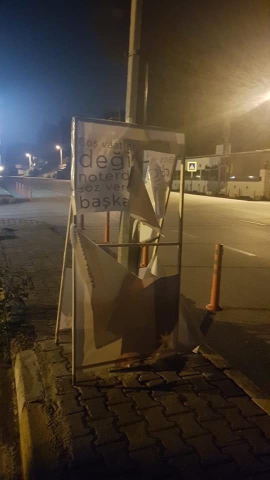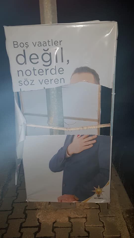 Sistemli bir şekilde AK Parti Buca Belediye Başkan Adayı Mustafa Arslan’ın afişlerini yırtan kişiler, vatandaş ihbarı ile takibe alındı. Kaynaklar'dan başlayarak Kuruçeşme mahallesine kadar cadde boyu konulan afişleri yırtarak ve kırarak gelen 3 kişiye polis müdahale etti ve bu kişileri gözaltına aldı. Kaynaklar mahallesinde başlayan olay, jandarma bölgesinde meydana geldiği için polis yakaladığı şahısları jandarmaya teslim etti.