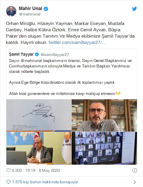 Tanıtım ve Medyadan Sorumlu Genel Başkan Yardımcısı Mahir Ünal'ın, Şamil Tayyar'ın başkan yardımcısı olarak atanmasına ilişkin yazısı Cumhurbaşkanı ve AK Parti Genel Başkanı Recep Tayyip Erdoğan tarafından onaylandı.Gazeteci kökenli Şamil Tayyar, AK Parti'den 24, 25, ve 26'ncı dönem Gaziantep Milletvekilliği yaptı.AK Parti Genel Başkan Yardımcısı Ünal, Twitter'dan yaptığı paylaşımda, "Orhan Miroğlu, Hüseyin Yayman, Markar Eseyan, Mustafa Canbey, Hatice Kübra Öztürk, Emre Cemil Ayvalı, Büşra Paker'den oluşan tanıtım ve medya ekibimize Şamil Tayyar da katıldı. Hayırlı olsun." ifadelerini kullandı.