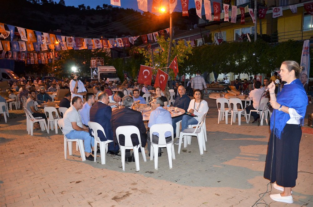 KAVACIK’IN TÜM OYLARINA TALİBİZKarabağlar’a bağlı Kavacık köyünde iftar yemeğine katılan Ceyda Bölünmez Çankırı, köy sakinleriyle köy kahvesinde bir araya geldi. Kavacık kadın girişimi üretim ve işletme kooperatifi üyesi kadınlarla üretim projeleri üzerine konuşan Çankırı, Mardin’de başlattığı topraktan tabağa projesini anlattı. İlk hasadı geçtiğimiz günlerde yapılan “Topraktan Tabağa” projesini İzmir’de de hayata geçireceklerini söyledi.Ak Partinin yüksel oy oranına sahip olduğu Kavacık’ta köy sakinlerine seslenen Çankırı, AK Parti dışında kalan oylara da talip olduklarını söyleyerek Kavacık’tan tam destek istedi. “Bu güne kadar PKK, PYD, FETÖ gibi terör örgütlerinin elbirliği ile yaptıkları karışıklıklar bizi yıkamadı” diyen Çankırı, “Şimdi seçim öncesi yaşatılan ekonomik kriz ortamının da hep birlikte üstesinden geleceğiz. Birliğimiz beraberliğimiz daim olsun” dedi. Çankırı, iftarın ardından Kavacıklılara kendi elleriyle lokma dağıttı.