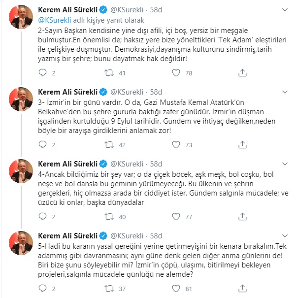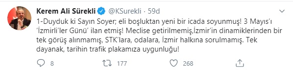 Başkan Sürekli açıklamasında şu ifadeleri kullandı: 1-Duyduk ki Sayın Soyer; eli boşluktan yeni bir icada soyunmuş! 3 Mayıs’ı ‘İzmirli’ler Günü’ ilan etmiş! Meclise getirilmemiş,İzmir’in dinamiklerinden bir tek görüş alınmamış, STK’lara, odalara, İzmir halkına sorulmamış. Tek dayanak, tarihin trafik plakamıza uygunluğu! 2-Sayın Başkan kendisine yine dışı afili, içi boş, yersiz bir meşgale bulmuştur.En önemlisi de; haksız yere bize yönelttikleri ‘Tek Adam’ eleştirileri ile çelişkiye düşmüştür. Demokrasiyi,dayanışma kültürünü sindirmiş,tarih yazmış bir şehre; bunu dayatmak hak değildir! 3- İzmir’in bir günü vardır. O da, Gazi Mustafa Kemal Atatürk’ün Belkahve’den bu şehre gururla baktığı zafer günüdür. İzmir’in düşman işgalinden kurtulduğu 9 Eylül tarihidir. Gündem ve ihtiyaç değilken,neden böyle bir arayışa girdiklerini anlamak zor! 4-Ancak bildiğimiz bir şey var; o da çiçek böcek, aşk meşk, bol coşku, bol neşe ve bol dansla bu geminin yürümeyeceği. Bu ülkenin ve şehrin gerçekleri, hiç olmazsa arada bir ciddiyet ister. Gündem salgınla mücadele; ve üzücü ki onlar, başka dünyadalar. 5-Hadi bu kararın yasal gereğini yerine getirmeyişini bir kenara bırakalım.Tek adammış gibi davranmasını; aynı güne denk gelen diğer anma günlerini de! Biri bize şunu söyleyebilir mi? İzmir’in çöpü, ulaşımı, bitirilmeyi bekleyen projeleri,salgınla mücadele günlüğü ne alemde?