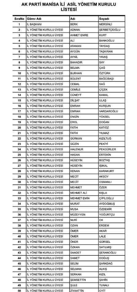 Sosyal medya hesabı üzerinde yönetim listesini paylaşan Mersinli, açıklamasında şu ifadelere yer verdi: ''AK Parti Genel Merkezimiz tarafından 28.12.2016 tarihinde İl başkanlığı görevine atandım. İl yönetim kurulunu belirlemek üzere çalışmalara başlayarak, öncelikle yönetim kurulu için başvuruları aldık. Yönetim kurulunu belirleme aşamasında partimize birçok başvuru oldu. AK Partiye gönül verip gösterdikleri yoğun talepten dolayı başvuran herkese öncelikle çok teşekkür ederim.Yapmış olduğum çalışmalar sonucunda yönetim kurulunu oluşturup Genel Merkezimizin onayına sunarak, elli (50) kişilik İl yönetim Kurulu üyelerimizi belirledim.İl yönetim Kurulumuzun AK Parti camiasına, Manisa’mıza hayırlara ve güzel hizmetlere vesile olmasını temenni eder, başarılar dilerim. Bugüne kadar olduğu gibi, bugünden sonrada hem AK Parti camiasının hem de Manisa kamuoyunun desteklerini bekler elli (50) kişilik yönetim kurulu listemizi paylaşır, saygılarımı sunarım. ''İşte AK Parti Manisa'nın yeni yönetimi kurulu üyeleri:
