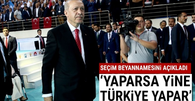 Cumhurbaşkanı ve AK Parti Genel Başkanı Recep Tayyip Erdoğan, Ankara Spor Salonu'nda AK Parti seçim beyannamesini açıkladı. Cumhurbaşkanı Recep Tayyip Erdoğan'ın açıklamalarından öne çıkan başlıklar:İŞTE AK PARTİ'NİN SEÇİM BEYANNAMESİAK Parti 2000 Kasım’dan beri girdiği her seçimden birinci çıkmış bir partidir. Milletimizin huzuruna ilk defa çıktığımız 2002’de çıktığımız seçimlerde yüzde 34 oy alarak iktidar olduk. Bu oran ülkemizin yakın tarihindeki en büyük başarıydı. 2007'de oyumuzu yüzde 47'ye çıkardık, tek başımıza iktidar olduk. 7 Haziran'da ilk kez çoğunluğu sağlayamadığımız bir seçim oldu. 1 Kasım'da seçimleri yeniledik ve yüzde 49,5 ile iktidara geldik. Ayrıca 10 Ağustos 2014 cumhurbaşkanlığı seçiminde yüzde 52 oy oranına ulaştık.İnşallah her iki seçimden de yüzümüzün akıyla çıkacağız. Vakit Türkiye Vakti, diyerek yola çıkıyoruz. Cumhurbaşkanlığı seçimini yüzde 50'nin çok üzerinde bir oyla kazanmayı hedefliyoruz.YAPARSA YİNE AK PARTİ YAPARBiliyorsunuz 6 Mayıs'ta seçim manifestomuzu İstanbul'da milletimize açıkladık. Bugün güçlü meclis, güçlü hükümet, güçlü Türkiye başlığıyla beyannamemizi "Yaparsa yine Ak Parti yapar" diyerek milletimizin takdirine sunuyoruz. Biz dünyamızdaki eğilimleri, yeniden şekillenen ilişkileri dikkatle analiz ederek bir yol haritası koyuyoruz, dijitalleşmeye ayrı önem veriyoruz. HEDEFLERİMİZE EMİN ADIMLARLA YÜRÜYORUZ2023'e 5 kala kendimizi ufuk çizgisi olarak belirlediğimiz 2053 ve 2071 hedeflerimize de emin adımlarla yürüyoruz. Korumacılık eğiliminin küresel düzeyde yükseldiği bir ortamda dışa açık ekonomik yapımızı güçlendireceğiz. Üretim gücümüzü yenilikçi ve farklılık oluşturmaya dayalı bir yapıya dönüştüreceğiz. Genç ve dinamik nüfusumuzun sunduğu fırsat penceresini en iyi şekilde değerlendireceğiz.Bir yandan kadın girişimciliğini güçlendirirken bir yandan kadınların iş gücüne katılma oranını yüzde 40'ın üzerine çıkaracağız. Yeni hedefimiz ülkemizi yüksek gelirli ülkeler ligine taşımak. Türkiye'yi en yüksek insani gelişmişlik düzeyine çıkarmak istiyoruz.TEKNOLOJİK GELİŞMELERE YOĞUNLAŞACAĞIZTeknolojik gelişmelere yoğunlaşacağız. Teknolojinin her alanında yetkin bir konuma geleceğiz. Bilginin üretiminde ve katma değer oluşturacak şekilde kullanımında girişimci ve yenilikçi bir anlayışla özel sektörün rolünü güçlendireceğiz. Mega projelerimizi birer birer hayata geçirmeyi sürdüreceğiz.Siber alanda da ülkemizin yerli ve milli teknolojik altyapısıyla organizasyon kabiliyetini güçlendireceğiz. Akıllı ve yeşil kent projeleriyle şehirlerimizi daha yaşanabilir bir hale kavuşturacağız. Gelecek nesillere kimliği olan şehirler bırakacağız.AB başta olmak üzere farklı bölgesel yapılarla ekonomik ve siyasi ilişkilerimizi daha da güçlendireceğiz. Yakın coğrafyamızda huzur ve refah için katkıda bulunmaya devam edeceğiz. Dünya 5'ten büyüktür çağrımızı kararlılıkla ifade etmeyi sürdüreceğiz. Vakit Türkiye vakti...MECLİS'İ GERÇEK GÜCÜNE BİZ KAVUŞTURDUKYeni dönemi güçlü meclis, güçlü hükümet, güçlü Türkiye olarak ifade ediyoruz. Bağımsız, tarafsız ve güçlü bir yargıyla da demokrasimizi sağlam temeller üzerine oturuyoruz. Cumhurbaşkanlığını kazanmak kadar mecliste çoğunluğu elde etmeyi de önemli görüyoruz. Yeni dönemde TBMM'yi daha güçlü konuma taşımaya kararlıyız. Meclis'i gerçek gücüne biz kavuşturduk.Hak ve özgürlükler konusunda yaptıklarımızı saymaya kalksak çok uzun bir liste çıkar. 24 Haziran’dan sonra da devam edeceğiz. Yeni dönemde cemevlerine hukuki statü kazandıracağız. Yasaklar ve yasakçı zihniyetle savaşmayı sürdüreceğiz.CEMEVLERİNİN HUKUKİ STATÜ SAĞLAYACAĞIZ24 Haziran seçimlerinden sonra demokrasimizi geliştirmeye devam edeceğiz, demokrasiyi bir üst lige çıkaracağız. Cemevlerinin hukuki statü sağlayacağız. Yasaklara ve yasakçı zihniyetle mücadelemizi artırarak devam ettireceğiz. 3 Y ile mücadele söz vermiştik, yasaklar, yolsuzluk ve yoksulluktu, bu mücadeleyi sürdüreceğiz.MÜCADELEYİ KARARLILIKLA SÜRDÜRECEĞİZAnamuhalefetin OHAL'i ağzına dolaması utançtır. FETÖ başta olmak üzere insanlarımızın inançlarını istismar eden yapılarla mücadeleyi kararlılıkla sürdüreceğiz. Sivil toplum alanının sağlıklı işleyebilmesi için devletin düzenleyici rolünü artırmayı planlıyoruz. Hukukun üstünlüğü ilkesini esas alarak herkesini hakkını daha iyi koruyacağı yöntemler uygulayacağız. Yargı süreçlerini kolaylaştırma ve basitleştirme çalışmalarına devam edeceğiz.Mahalle ve semt bekçilerini artırarak kentleri daha huzurlu hale getireceğiz. Siber suçlar narkotik suçlarla etkin mücadele yöntemlerini geliştireceğiz. Terörle mücadelemizi inlerine girerek sürdüreceğiz. TÜM OKULLAR TAM GÜN EĞİTİME GEÇECEKÖnümüzdeki yıldan itibaren tüm okullar tam gün eğitime geçecek hale gelecektir. Eğitimde kalite seferberliği başlatıyoruz. Müfredatı ülkemizin ihtiyaçlarına ve çağın gereklerine göre güncelleyeceğiz. Kültür sanat faaliyetlerine daha fazla kaynak aktaracağız.Önümüzdeki yıldan itibaren tüm okullar tam gün eğitime geçecek hale gelecektir. Eğitimde kalite seferberliği başlatıyoruz. Müfredatı ülkemizin ihtiyaçlarına ve çağın gereklerine göre güncelleyeceğiz. KÜLTÜR MERKEZİ OLMAYAN İLİMİZ KALMAYACAKKültür sanat faaliyetlerine daha fazla kaynak aktaracağız. Kültürümüzü dünyaya tanıtan sinema ve tv dizilerine özel destek vereceğiz. Külliyemiz çevresinde inşası süren 5 milyon kapasiteli kütüphanemizi dünya çapında bir merkez haline getireceğiz. Kültür merkezi olmayan ilimiz kalmayacak. Aile hekimliğini daha da yaygınla