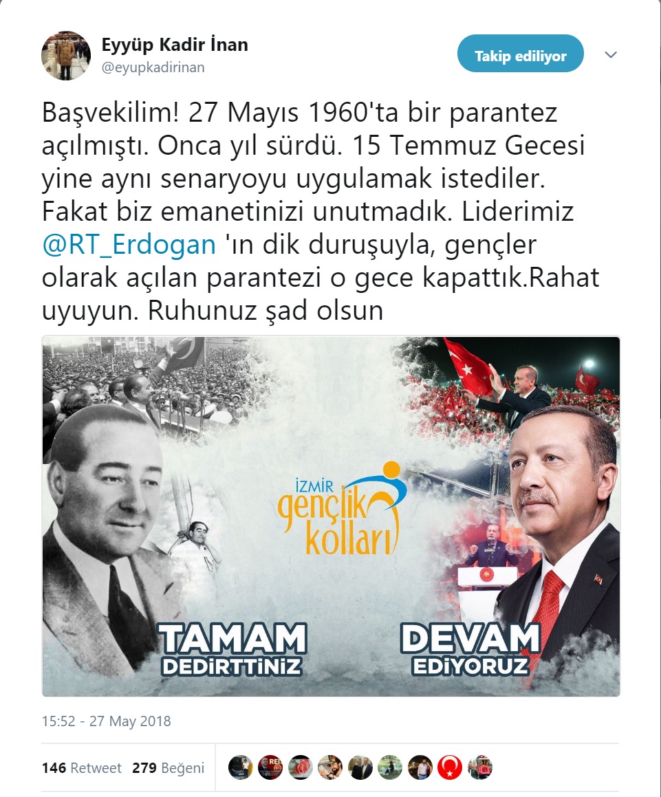27 Mayıs 1960’ta yapılan darbenin ardından dönemin Başbakan’ı Adnan Menderes ile Dışişleri Bakanı Fatin Rüştü Zorlu ve Maliye Bakanı Hasan Polatkan, darbecilerin kurduğu mahkemelerce idama mahkum edildi ve bu hüküm infaz edilerek, Türkiye’nin demokrasi tarihine kara bir leke düşüldü. Ancak 27 Mayıs’taki darbe ile açılan bu parantezin içine daha sonraki yıllarda başka darbeler de sığdırıldı. Türkiye’nin demokrasi mücadelesine yeni lekeler sürüldü.27 Mayıs darbesinin yıl dönümünde sosyal medya hesaplarından bu darbelere gönderme yapan bir mesaj paylaşan Ak Parti İzmir İl Gençlik Kolları Başkanı Eyüp Kadir İnan, Türk milletinin 15 Temmuz’daki şanlı direnişi ile 27 Mayıs’ta açılan bu parantezin kapatıldığını yazdı.O PARANTEZİ 15 TEMMUZ’DA KAPATTIKİl Gençlik Kolları Başkanı İnan, “Başvekilim! 27 mayıs 1960'ta bir parantez açılmıştı. Onca yıl sürdü. 15 Temmuz Gecesi yine aynı senaryoyu uygulamak istediler. Fakat biz emanetinizi unutmadık. Liderimiz @RT_Erdogan 'ın dik duruşuyla, gençler olarak açılan parantezi o gece kapattık. Rahat uyuyun. Ruhunuz şad olsun” diye yazdı.YÜZLERCE YORUM GELDİAK Parti İzmir İl Gençlik Kolları Başkanı Eyüp Kadir İnan’ın bu paylaşımı sosyal medyada büyük ilgi gördü. Yüzlerce kişi Eyüp Kadir İnan’ın bu mesajına destek veren yorumlarla karşılık verdi.