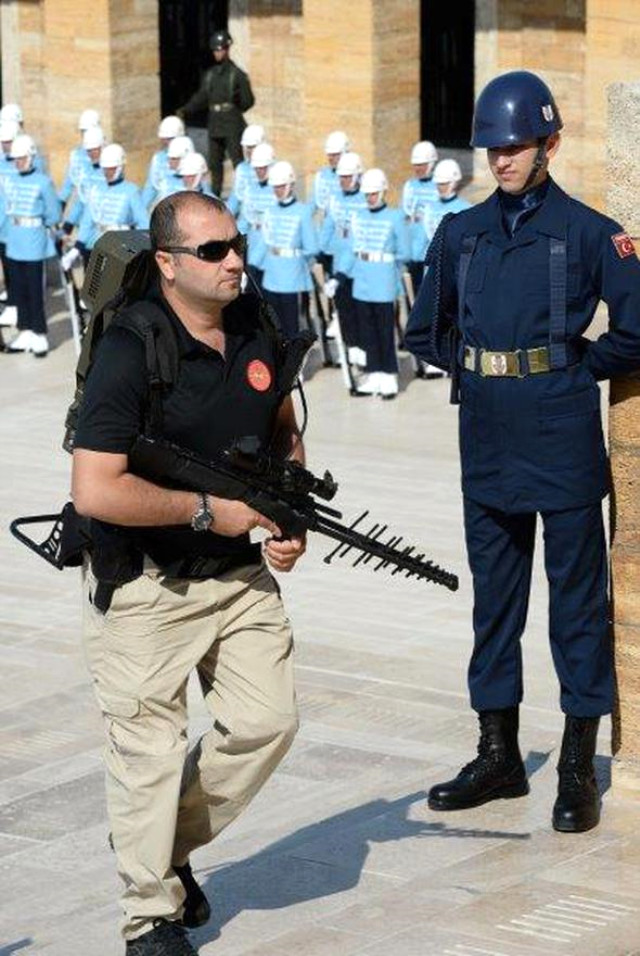 Büyük Zafer'in 95. yılı tüm yurtta kutlanıyor. Anıtkabir'deki törene Cumhurbaşkanı Recep Tayyip Erdoğan, TBMM Başkanı İsmail Kahraman, Başbakan Binali Yıldırım ve CHP lideri Kemal Kılıçdaroğlu, MHP Genel Başkanı Devlet Bahçeli de katıldı. Tören sonrası Erdoğan ile Bahçeli bir süre sıcak bir şekilde sohbet etti. Törende yoğun güvenlik önlemleri dikkat çekti. Cumhurbaşkanlığı korumalarının 'dronesavar' silahı taşıdığı da görüldü.YOĞUN GÜVENLİK ÖNLEMLERİ ALINDIAnıtkabir'de devlet erkanının katıldığı töreni geçen yıl olduğu gibi vatandaşlar da izledi. Tören dolayısıyla Anıtkabir çevresinde yoğun güvenlik önlemi alınırken garnizonda görevli askerler, elektronik cihazlarla kimlik kontrolünün ardından Anıtkabir'e alındı. Güvenlik önlemleri kapsamında, x-ray cihazları da tören alanı girişlerine yerleştirildi. X-ray cihazlarından geçen askerlerin bazılarına kimlik kontrolü yapıldığı görüldü. Elle arama noktalarında ise sivillerin üzeri aranırken bazı askerlere kimlik kontrolü uygulaması yapıldığı görüldü. Çatılarda keskin nişancıların olduğu da objektiflere yansıdı. Anıtkabir'e çıkan bazı yollar güvenlik nedeniyle trafiğe kapatılırken, Büyükşehir Belediyesine ait bir kamyonun Anıtkabir'e çıkan bir yolun ortasında park halinde olduğu görüldü.DRONESAVAR DA KULLANILDIAnıtkabir'deki törende, "dronesavar" olarak bilinen silahı taşıyan Cumhurbaşkanlığı korumaları da dikkat çekti.