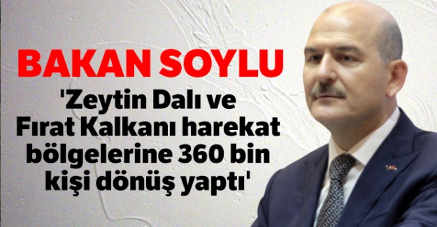 Türkiye Belediyeler Birliği toplantısında konuşan İçişleri Bakanı Süleyman Soylu, "Zeytin Dalı ve Fırat Kalkanı harekat bölgelerine 360 bin kişi dönüş yaptı."dedi.
