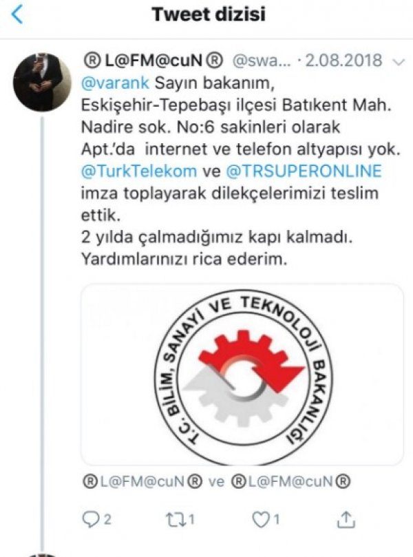 Türkiye'nin yeni hükümet sisteminin bakanlarından Sanayi ve Teknoloji Bakanlığı, bürokratik oligarşinin yıkıldığını gözler önüne seriyor. Daha önce sosyal medyadan gelen talepler ve şikayetlere koşan Bakan Mustafa Varank, yine Twitter üzerinden bir gencin problemini çözdü.İNTERNET SORUNUNU ÇÖZDÜTwitter hesabından bir vatandaş, oturduğu evde bulunan internet ve altyapı problemini Bakan Varank'a iletti. Kendisine ulaştırılan tüm talepleri değerlendiren Varank, bu problemi de es geçmeyerek kısa sürede çözüme kavuşturdu.