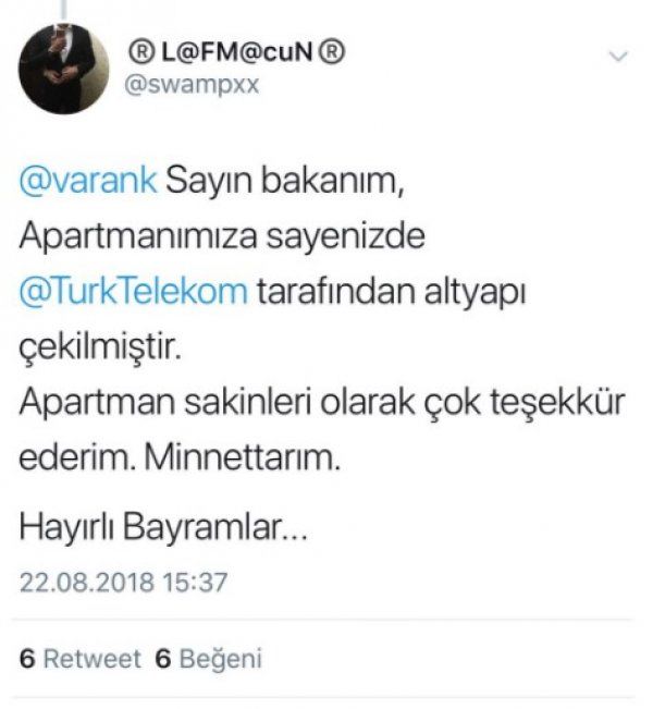 Varank'ın talimatıyla harekete geçen Türk Telekom, kısa süre içerisinde bölgeye gerekli alt yapı sistemlerini çekerek problemi çözdü.