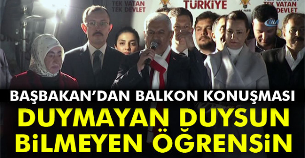 Başbakan Binali Yıldırım, Cumhurbaşkanlığı hükümet sistemi halk oylamasının sonuçlanmasının ardından teşekkür konuşması yaptı. Yıldırım, birlik mesajı vererek, “Açıkça söylüyorum, bu halk oylamasının kaybedeni yoktur, kazanan Türkiye’dir, kazanan Aziz milletimdir” dedi.Başbakan Binali Yıldırım, Cumhurbaşkanlığı hükümet sistemi halk oylamasının sonuçlanmasının ardından balkon konuşması yaparak vatandaşlara teşekkür etti. Yıldırım, “Bilmeyen öğrensin, duymayan duysun. Kardeşiz, tek vücut, tek bir milletiz. Bölücü hainler, aklına koysun, kardeşiz, tek vücut tek bir milleti. Aziz vatandaşlarım, Cumhurbaşkanlığı hükümet sistemini öngören gayri resmi sonuçlara göre evetle neticelenmiştir, Cenab-ı Mevlam hayırlı uğurlu eylesin. Yüksek bir katılımla sandık başına giderek tercihini yapan demokrasimize sahip çıkan bütün vatandaşlarıma teşekkür ediyorum. Halk oylamasının güvenliğini sağlayan bütün güvenlik teşkilatı ve bütün kamu görevlilerine milletim adına teşekkür ediyorum. Sandık görevlilerine müşahitlere teşekkür ediyorum. Bugün ilk kez hak oylamasında sandığa giden 1 milyon 269 bin gencimizi özellikle kutluyorum. Huzur içinde neticelenen bu oylama demokrasi tarihimizde milletin kendi kararıyla verdiği bir seçimdir. Demokrasi tarihimizde bu oylamayla yeni bir sayfa açılmıştır, herkes emin olsun ki çıkan bu sonucu halkımızın refahı, huzuru için en güzel şekilde değerlendireceğiz, teşekkürler Türkiye, Aziz milletim, yurt dışına yaşayan ve Türkiye’nin demokrasinine sahip çıkan bütün vatandaşlarımıza özellikle teşekkür ediyorum. Bir özel teşekkür ve bir selam kurucu genel başkanımız, liderimiz Sayın Cumhurbaşkanımız, Recep Tayyip Erdoğan’a teşekkür ediyorum. Kendisini buradan defalarca bu balkon konuşmasını yaptığı yerden sevgiyle saygıyla bütün teşkilatım adına selamlıyorum” ifadelerini kullandı.Bir teşekkür de Bahçeli’ye“Demokratik tercihin ortaya çıkması için hepimiz çok çalıştık, çok gayret ettik” diyen Yıldırım, “Bu sürede sahaya çıkan herkese ülkem milletim, demokrasi adına şükranlarımı sunuyorum. Heyecanınız, coşkunuzla kampanya boyunca bizi bir an bile yalnız bırakmayan yol arkadaşlarıma teşekkür ediyorum. Bu anayasa değişikliğinin hazırlanmasında beraber çalıştığım MHP Genel Başkanı Devlet Bahçeli’ye, partisinin bütün teşkilatlarına teşekkür ediyorum. Ayrıca bu süreçte diğer partilerimize de halk oylaması sürecinde yaptıkları olumlu katkıdan dolayı şükranları sunuyorum. Şimdi durmak yok, yola devam. Kaldığımız yerden yola devam ediyoruz. Elbette farklı düşüncelerimiz, farklı çözüm önerilerimiz olacak ama neticede birliğimizi beraberliğimizi gözümüz gibi koruyacağız, demokrasimizin güzelliği de budur. Farklı fikirlere sahip olmak hiçbir şekilde birbirine üstünlük sağlamak değildir. Meydanlarda farklı şeyler söyledik, millete farklı şeyler anlattık ama son sözü millet söyledi, ‘evet’ dedi noktayı koydu. Yola çıkarken söylediğimiz gibi halkın iradesi nasıl tecelli ederse o sonuç başımızın tacıdır dedik. Halkımız seçimini yapmış Cumhurbaşkanlığı yönetim sistemine olur vermiştir. Bu ülke bu millet artık hiçbir vesayete, hiçbir harici müdahaleye hiçbir tehdide boyun eğmeyeceğini bir kez daha göstermiştir. Bu seçimlerle, 15 Temmuz alçak darbe girişimini yapan terör örgütüne, bölücü terör örgütüne, Türkiye’ye düşmanlık yapan dış mihraklara en güzel cevabı milletimiz sandıkta vermiştir” şeklinde konuştu. Yıldırım, konuşmasını şöyle sürdürdü: “Bu seçimler, Türk demokrasisinin olgunluk düzeyini bütün dünyaya göstermiştir. Bizler Türkiye Cumhuriyeti devletinin birinci derece eşit vatandaşlarıyız. Meşru siyasi alandaki rekabet, birlik ve bütünlüğümüzü asla bozamaz, bozamayacaktır. Vatandaşlarımızın tercihi doğrultusunda geleceği güven içinde inşa edeceğiz. Açıkça söylüyorum, bu halk oylamasının kaybedeni yoktur, kazanan Türkiye’dir, kazanan Aziz milletimdir. Şimdi artık dayanışma bir olma beraber olma birlikte Türkiye olma zamanıdır. Sandıktan bizim tercihimiz ‘evet’ çıktığı için mutluyuz. Milli iradeyle aynı yönde olmak büyük bir şereftir. Bu büyük mutluluğa gölge düşürecek her türlü davranışı ve yorumdan elbette kaçınacağız. Demokratik olgunluğumuzu bize yakışan vakarla anlatacağız. Biz de öteki beriki yoktur, kimse mahsun olmasın.”Bu maratonun bugün başarıyla sonuçlandığını belirten Yıldırım, “Cumhurbaşkanımız birçok ilde, Anadolu’da vatandaşlarımızla kucaklaştı. Kampanya bütün şehir meydanlarında bir bahar şölenine dönüştü. Toplumun bütün fertleri ifade ederek meydanlara döküldü, huzur içinde bu oylamaya gerçekleştirdik. Süreç boyunca yurt dışındaki vatandaşlarımıza vatanseverlikle ülkemize, birliğimize sahip çıktılar. Yine bu süre içinde Türkiye’nin ayağına basmak isteyenler bugün bir mahcubiyeti yaşamışlardır, onları dediği değil Türkiye’nin milletin dediği oldu. Şimdi önümüze, işimize bakacağız. Şimdi milletimizin aydınlık yarınları için uzak ufuklara bakacağız. 2019 seçimlerine kadar gerekli hazırlıkları yapıp çalışarak yeni yönetim sistemini yapılacak ilk genel seçimde hayata geçireceğiz. Bugün demokrasi, millet, hukuk devleti kazandı. Bugün yurt içinde, yurt dışında yaşayan 83 milyon vatandaşımız kazandı. Bu sistem değişikliğiyle beraber, birliğimizi, beraberliğimizi daha çok güçlendireceğiz. Ekonomimizi daha da büyüteceğiz. Kalkınmamızı daha güçlü hale getireceğiz. Türkiyeyi terörden arınmış, birliğini, beraberliğini kardeşliği sağlamlaştırmış örnek lider ülkel