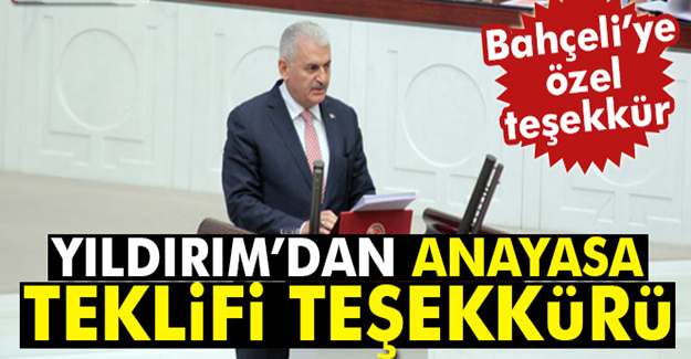 Başbakan Binali Yıldırım, TBMM Genel Kurulunda anayasa değişiklik teklifinin kabul edilmesinin ardından parti grubuna teşekkür konuşması yaptı. Yıldırım, konuşmasında, "Siz bugün burada bu Gazi Meclis'te bir kez daha tarih yazdınız. Allah sizden razı olsun. Siz, AK Parti grubu olarak Türkiye'nin aydınlık geleceğini şekillendirdiniz. Siz, yılların hasretini özlemini, son erdirdiniz. AK Parti, 14 yıllık iktidar döneminde kuşkusuz çok büyük işler yaptı, ancak bugün yaptığımız iş bugün ortaya çıkardığımız eser hiç kuşkunuz olmasın bugüne kadar yapılmış işlerin en büyüğünden biridir, en büyük eserlerden biridir. Bugünlere sabırla ilerledik, sebatla ilerledik. Bugünlere direnerek, mücadele ederek geldik. Bizim tek bir derdimiz var, çocuklarımıza daha güçlü, daha aydınlık, daha müreffeh bir ülke bırakmak. Bugün yazdığımız şu tarih son 12 günün, son 15 günün eseri değil, son 14 yılın hatta son 10 yılların mücadelesinin sonucudur. Bu sonuca ulaşmak için emek vermiş her bir isimsiz kahramanı buradan saygıyla yad ediyorum. Bayrak asarak, kapı kapı dolaşarak malını mülkünü bu yola feda ederek her türlü cefaya katlanarak, Türkiye'ye bugünü yaşatanlara şükranlarımı sunuyorum. Elbette bu büyük mutluluğu tarihi anı yaşarken bu mücadelenin kurucu liderine, Genel Başkanına, Sayın Cumhurbaşkanımız Recep Tayyip Erdoğan'a burada saygılarımızı iletiyorum" ifadelerini kullandı.Başbakan Yıldırım, MHP Genel Başkanı Devlet Bahçeli'ye de sürece verdiği katkı dolayısıyla teşekkürlerini iletti. Sondan bir önceki etabın tamamlandığına işaret eden Yıldırım, "Bizim grubumuz kaya gibidir, bir parça bile kimse koparamaz. Grubumuz için çok şey söylediler. Grubumuza güveniyoruz, grubumuz üzerinde oynanan oyunları da kınıyoruz dedik ve işte o büyük grup, gururumuz AK Parti grubu. İşte grup işte sonuç. Konuşanlar, senaryo yazanlar bir kez daha hayal kırıklığına uğradılar, bir kez daha tuş oldular. Milletimiz de bu mücadeleyi evet oyuyla taçlandıracak, Türkiye yeni bir döneme girecek" şeklinde konuştu.