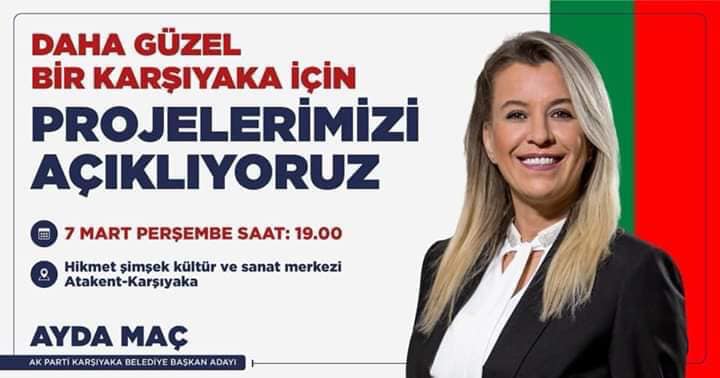 AK Parti Karşıyaka İlçe Başkanı İsmail Çiftçioğlu yapmış olduğu açıklamada; “ yaklaşık 60 günden bu yana sahada Belediye Başkan Adayımız Ayda Maç'ın öncülüğünde tüm teşkilat olarak sokak sokak, kapı kapı çalışmalar yapıyoruz. Bu çalışmalar neticesinde Karşıyaka'mızın tüm paydaşları ile diyaloglar kurarak kentimizin ihtiyaçlarını ve sorunlarını kentimizin bireyleri ile beraber tespit ediyoruz. Karşıyaka'mıza yakışır, Karşıyaka'mıza nefes aldıracak vizyon projeler geliştirdik. Belediye Başkan Adayımız Ayda Maç'ın proje insanı olması ve belediyeciliği bilen bir bayan olmasından dolayı Karşıyaka'mız çok şanslı. Bu vesileyle 7 Mart Perşembe Akşamı Saat 19.00'da Karşıyaka Hikmet Şimşek Kültür ve Sanat Merkezi'nde Daha Güzel Bir Karşıyaka İçin Düzenleyeceğimiz Proje Lansmanı Toplantısına tüm Karşıyaka halkımız davetlidir. “