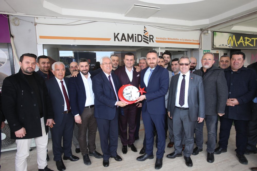 Nasrettin Hoca bilim, kültür ve sanat merkezi olacakUzundere’de bulunan Nasrettin Hoca heykelinin de projesinin bittiğini, İZKA’dan 1 milyon TL’lik destek aldıklarını hatırlatan Selvitopu, ” İhale sürecini başlattık. Burası bilim, kültür ve sanat merkezi olacak. Ağırlıkla çocuklarımızın kullanacağı bir yer olacak. Ayrıca oradaki havuzları da açtık. 1,5 ayda 10 bin kişi geldi.”dedi.Her zaman yanınızdayızKAMİDER Başkanı Hasan Özkaya ise Başkan Selvitopu ile bu süreçte güzel çalışmalar yaptıklarını sektörel veya farklı konularda ne zaman sıkıntıları olsa Başkan Selvitopu'nun elinden geldiğince yardımcı olduğunu hatırlatarak, “Verdiği desteklerden dolayı Başkanımıza teşekkür ediyorum. Kendisi yeniden aday olmuştur. KAMİDER olarak hem sektörel hem de sosyal anlamda Karabağlar’a destek olan bir dernek olarak her zaman yanınızdayız. Seçildiğiniz takdirde Karabağlar’a yapılabilecek sektörümüzle alakalı, sosyal projelerle alakalı elimizden ne geliyorsa sonuna kadar yanınızdayız” dedi.Karabağlar'a ivme kazandıracakKarabağlar’ın her yönüyle sıkıntılı bir ilçe olduğunu ifade eden Özkaya “Sizler en sıkıntılı olan imar planlarına geldiğiniz günden bu yana ciddi bir adım attınız. İmar planlarını bitirdiniz. Bu planlar kısa vadede ciddi çözümler üretmeyebilir ama Karabağlar’a bir ivme kazandıracağını ve çehresinin değiştireceğini düşünüyoruz. Bunu da siz çözdünüz başkanım, inşallah daha güzel şeyler olur” diye konuştu.Toplantının ardından Başkan Selvitopu, Hasan Özkaya'ya üzerinde Atatürk fotoğrafının bulunduğu ay-yıldızlı duvar saati hediye etti.