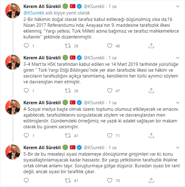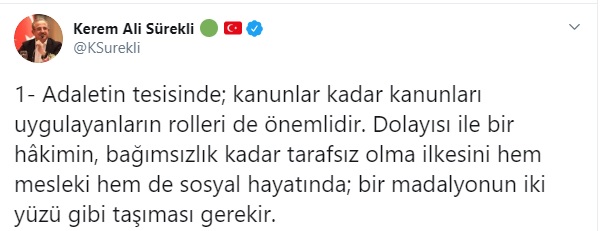 Reel Politika - Sosyal medyadaki paylaşımları nedeniyle görevden uzaklaştırılan Karşıyaka Adliyesi Hakimlerinden Ayşe Sarısu Pehlivan’a CHP İzmir İl Başkanı Deniz Yücel sahip çıkarak, ‘’ Vicdan, insanlık ve merhamet yargılanamaz’’sözleriyle AK Parti’yi eleştirdi. Yücel’e yanıt AK Parti İzmir İl Başkanı Kerem Ali Sürekli’den geldi. Sürekli, ‘’ Buradan siyasi bir rant değil ancak siyasi taraflılık çıkar ‘’ dedi.AK Parti İzmir İl Başkanı Sürekli sosyal medya hesabından şu ifadelere yer verdi:1- Adaletin tesisinde; kanunlar kadar kanunları uygulayanların rolleri de önemlidir. Dolayısı ile bir hâkimin, bağımsızlık kadar tarafsız olma ilkesini hem mesleki hem de sosyal hayatında; bir madalyonun iki yüzü gibi taşıması gerekir.2- Bir hâkimin doğal olarak tarafsız kabul edileceği düşünülmüş olsa da;16 Nisan 2017 Referandumu’nda; Anayasa’nın 9. maddesine tarafsızlık ilkesi eklenmiş; “Yargı yetkisi, Türk Milleti adına bağımsız ve tarafsız mahkemelerce kullanılır” şeklinde düzenlenmiştir.3- 4 Mart’ta HSK tarafından kabul edilen ve 14 Mart 2019 tarihinde yürürlüğe giren “ Türk Yargı Etiği Bildirgesi”nde yer alan tarafsızlık ilkesi ise hâkim ve savcıların tarafsızlığını açıkça tanımlamış, kendilerini her türlü ayrımcı söylem ve davranıştan men etmiştir.4- Sosyal medya başta olmak üzere; toplumu olumsuz etkileyecek ve amacını aşabilecek, tarafsızlıklarını sorgulatacak söylem ve davranışlardan men edilmişlerdir. Gündemdeki örneğimiz; ne yazık ki adalet sağlayan bir makam olarak bu güveni sarsmıştır.5- Bir de bu meseleyi siyasi malzemeye dönüştürme girişimleri var ki; konu siyasallaştırılamayacak kadar hassastır. Bir yargı yetkilisinin tarafsızlık ihlaline ortak olmak anlamı taşır. Soruşturmaya gölge düşürür. Buradan siyasi bir rant değil, ancak siyasi bir taraflılık çıkar.