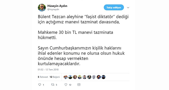 Başkan Erdoğan'ın avukatı Aydın, sosyal paylaşım sitesi Twitter'den yaptığı paylaşımda, "Bülent Tezcan aleyhine 'faşist diktatör' dediği için açtığımız manevi tazminat davasında, mahkeme 30 bin TL manevi tazminata hükmetti. Sayın Cumhurbaşkanımızın kişilik haklarını ihlal edenler, konumu ne olursa olsun hukuk önünde hesap vermekten kurtulamayacaklardır" ifadelerini kullandı.