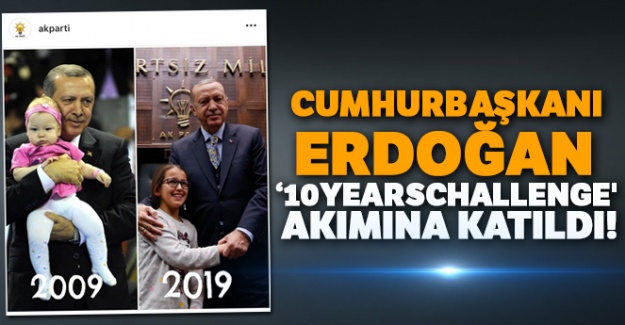 Sosyal medyada gündem olan "10YearsChallenge" akımına Cumhurbaşkanı Erdoğan da katıldı. AK Parti'nin resmi instagram hesabından “10YearsChallenge" etiketiyle Cumhurbaşkanı Erdoğan'ın fotoğrafı paylaşıldı. Fotoğrafın altında, "Cumhurbaşkanımız Recep Tayyip Erdoğan, dünden bugüne çocuklarla. #10Years Challenge" ifadesi yer aldı. İnstagram'dan yayınlanan fotoğraf kısa sürede çok sayıda beğeni ve yorum aldı.