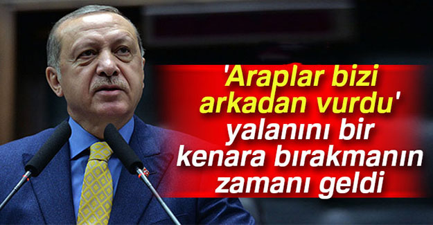 Cumhurbaşkanı Recep Tayyip Erdoğan, AK Parti grup toplantısında yaptığı açıklamada, “Geçmişte ders kitaplarımızda kasıtlı ve yanlış bir şekilde yer aldığı için nesiller boyunca zihinlere kazınmış olan ‘Araplar bizi arkadan vurdu’ yalanını artık bir kenara bırakmanın zamanı gelmiştir. Bugün ülkemizde devletimize ve milletimize karşı savaşan PKK, FETÖ, DHKP-C, DEAŞ gibi terör örgütleri yüzünden nasıl toplumun belli kesimlerini toptan suçlayamazsak, Birinci Dünya Savaşı yıllarındaki bir takım yanlışlar yüzünden tüm Arapları da itham edemeyiz” ifadelerini kullandı.