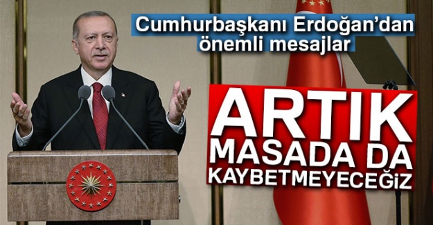 Terörle mücadelede Türkiye sınırları içinde ve dışında böylesine büyük kayıplar vermenin ve verdirmenin kendi tercihleri olmadığını ifade eden Erdoğan, “Devlet ve millet olarak varlığımıza yönelen tehditler ve saldırılar karşısında bu mücadeleye mecbur kalıyoruz. Milletimizi kalkındırmak, refahımızı artırmak için kullanmamız gereken kaynaklarımızı terörle mücadeleye tahsis etmek zorunda kalıyoruz. Asla başaramayacakları gün gibi aşikar olduğu halde terör örgütlerinin ısrarla üzerimize salınmasının gerisindeki amaçlardan birinin bu olduğunu da biliyoruz. İşte bu kısır döngüyü kırmak için son yıllarda terörle mücadele stratejimizi değiştirdik. Artık tehdidin, tehlikenin kapımıza dayanmasını beklemiyoruz. Sivrisineklerle uğraşmak yerine bataklığın kendisini kurutmaya yönelik hamleler yapıyoruz" şeklinde konuştu. "FETO ihanet çetesinin de tıpkı PKK gibi, tıpkı DEAŞ gibi, tıpkı diğer terör örgütleri gibi tek hedefi ülkemizin birliğidir, beraberliğidir, geleceğidir” açıklamasında bulunan Erdoğan, Türkiye’nin kendi kararlarını alıp, kendi belirlediği hedeflere doğru ilerledikçe karşısına çıkartılan engelleri giderek daha kolay aşmaya başladığını kaydetti. Erdoğan, “Daha düne kadar bize adeta öcü gibi gösterilen, ‘yapılamaz’ denilen, ‘altından kalkılamaz’ denilen, ‘başarılamaz’ denilen nice işin üstesinden hamdolsun geldik geliyoruz. Sahada mesafe kat ettikçe, yıllarca ülkemize kuru tehditlerle patinaj yaptıranların gerçek yüzlerini ve güçlerini görme imkanı da bulduk. Sahada karşımızda duramayanların, diplomasi, siyaset, ekonomi, psikoloji gibi yöntemlerle kurdukları tuzakları da birer birer teşhis ve teşhir ediyoruz. İnşallah bundan sonra işimiz daha kolay. Şehitlerimize manevi borcumuzu ödeyebilmek, gazilerimize layık olabilmek için artık daha fazla imkana sahibiz. Yeni yönetim sistemimizle karar alma ve uygulama mekanizmalarımızı tıkayarak Türkiye’yi istedikleri gibi yönlendirenlerin bir kozlarını daha ellerinden aldık. Bugün geleceğimize dün olduğundan çok daha ümit var bir şekilde bakıyoruz. İnşallah 2023 hedeflerimize ulaştığımızda her şey çok daha farklı hale gelecek" ifadelerini kullandı.“GAVUR ANKARA’YI BOMBALIYOR, DAYANIN GELİYORUZ”