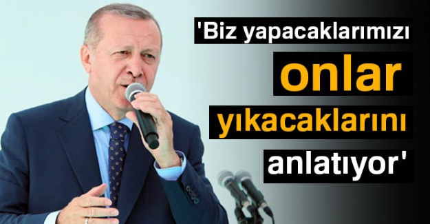“Al birini vur ötekini. Bunlardan ülkeye Cumhurbaşkanı olacak öyle mi? Buradan tüm milletimi sesleniyor ve diyorum ki; siz bu vaatle gelenlere AK Parti Türkiye’de 284 bin yeni derslik yaptı onları da yıkacak mısınız? AK Parti 585 bin yeni öğretmen göreve başlattı. Onları da görevden alacak mısınız? Bunların gözü var görmez, kulağı var duymaz, bunların kalpleri mühürlü. AK Parti Türkiye’de 131 yeni üniversite açtı. Onları da kapatacak mısınız? AK Parti 69 milyon kişiye geniş bant internet hizmeti sağladı. Onları da kesecek misiniz? 1245 yeni hastane, 130 bin yeni hastane yatağı kazandırdı. Onları da kaldırıp atacak mısınız? 540 bin sağlık çalışanını işe aldı, onları da kapı dışarı mı edeceksiniz? 5 bine yakın yeni ambulansı hizmete soktu. Bunları hurdaya mı çıkaracaksınız? Ambulansımız bile yoktu. Hastalar kamyonetlerde taşınıyorlardı. 817 bin yeni konut yaptık. Onları da yıkacak mısınız? Eşek ölür kalır semeri, insan ölür kalır eseri. AK Pati Türkiye’de 29 bin kilometre yeni bölünmüş yaptı. Siz bunların asfaltlarını söküp tarlaya mı dönüştüreceksiniz? 383 kilometre uzunluğa sahip tünel açtı. Taşla toprakla dolduracak mısın Bay Kemal. AK Parti yüksek hızlı tren hatları yaptı, siz yeniden kara terene mi döneceksiniz? Ak Parti Türkiye’de 29 havalimanı inşa etti. Yurt dışı uçuş sayısını 307’ye çıkardı. Uçuşları kapatacak mısınız? AK Parti 525 baraj, 528 Hidroelektrik santrali, 227 içme suyu tesisi, Bin 238 sulama tesisini açtı. Bunları yıkıp suları denize mi akıtacaksınız? 5 milyon hektar alanı ağaçlandırdı. 242 milyar lira sosyal yardım yaptı. Siz bunları garip gurebadan geri mi isteyeceksin? Emeklilerin maaşını üç katına, dört katına çıkardı. En son bayram ikramiyesi getirdi. Bunları yeniden eski seviyeye mi getireceksiniz. Ak Parti geldiği zaman paramızda 6 sıfır vardı. Tuvalete kaça gidiyorduk. Bir milyon liraya. Ne yaptık 6 sıfırı attık. Ne yapacaksınız sıfırları geri mi getireceksiniz? İhracatı 36 milyar dolardan aldık, şimdi 162 milyar dolara çıkardık. Geri mi getireceksiniz. Avrasya Tüneli, Osmangazi köprüsü gibi daha nice dev eseri dinamitleyip yerle yeksan mı edeceksiniz? Savunma sanayinde yaptığı insansız hava araçlarını, tüfekleri, füzeleri, tankları geçmişte olduğu gibi toprağa mı gömeceksiniz. Nuri Demirağ ilk yerli uçağı yapan insandır. Bunlar ne yaptı biliyor musunuz? Fabrikayı kapattı gaz ocağı fabrikasına dönüştürdü. Bunlar sanayi, bilişim teknolojisinden anlamaz. Ak Pati terör örgütlerini başını eziyoruz. Terör örgütünün liderini cezaevinde ziyaret eden adamdan ne bekliyorsunuz? Ankara’da beraber yürümediler mi bunlar? Bunlara 24 Haziran bir Osmanlı tokadı atmaya hazır mısınız? AK Parti Suriye’de 4 bin kilometre alanı güvenli hale gösterdi. Siz buraları tekrar terör yuvası mı yapacaksınız?”Muğla’ya 16 yılda 19 katrilyon yatırım Cumhurbaşkanı Erdoğan Muğla’ya son 16 yılda yapılan yatırımlar hakkında da bilgi verdi. Erdoğan, “24 Haziranda bu zihniyeti Ülkemizi bırakmayacaksınız değil mi? CHP’nin ve öteki adaylar neleri yıkacakları ile uğraşsınlar. Son 16 yılda Muğla’ya 19 katrilyon liralık yatırım yaptık Muğla’ya. Onlar yıkar biz yaparız. İnşallah daha çok şeyler yapacağız. Sağlık, eğitim, ulaşım, enerji, turizmde. Eğitimde 2975 derslik. Öğrenciler için 2 bin 837 kişilik yurt yaptık. Birkaç yıl içinde Fethiye’de ve Muğla’da toplam 5 bin kişilik yurt açacağız. Sağlıkta toplam 30 sağlık tesisi inşa ettik. Muğlalılar artık şehir dışına tedaviye gitmeyecekler” dedi.“İş bilenin, kılıç kuşanın” AK Parti iktidarının yaptıklarını anlatan Cumhurbaşkanı Erdoğan CHP’nin adayı Muharrem İnce’ye seslenerek, “İş bilenin kılıç kuşananın. Bay Muharrem bunlar senin işin değil, bunlar ustalık ister ustalık. Bu ülkenin çıraklarla uğraşacak zamanı yok. Bu kardeşiniz İtalyanlar ile anlaştı. Ortak helikopterimizi yapıyoruz. Atak helikopteri. Bay Muharrem ve Bay Kemal’in böyle bir derdi yok. Bu helikopterler içeride ve dışarıda teröristlere ne yapıyor? Mezar yapıyor mezar. Çıkmış diyor ki ‘bunun parçaları dışarıdan geliyor’ SİHA’larımızın yüzde 96’sı yerli. Ama şimdi biz yapıyoruz. Gabar’da Tendürek’te bunların inlerine girdik mi? Sadece Afrin’de etkisiz hale getirilen 4 bin 500 kişi. Cerablus’u katmıyorum. Sadece Afrin’i söylüyorum. ÖSO’dan Allah razı olsun. Onlar Mehmedimiz ile el ele verdiler. Bay Kemal ÖSO’ya terörist diyor. Yazıklar olsun sana. Benim Mehmedim ile birlikte savaşanlara nasıl terörist diyorsun. Afrin Komutanına ne dedi. ‘Apoletlerini sökeceğim” dedi. Senin geleceğin yok zaten Aç tavuk kendini buğday ambarında sanırmış. Neymiş biz iftar sofrasına katıldık. Malatya’da. 2. Ordu Komutanı orda. O oranın protokol mensubu zaten. Tayyip Erdoğan kim? O da Başkomutan. Anayasaya göre ben Başkomutanım. Bay Muharrem sen nesin. Sen çırak bile değilsin. Dur bakalım. Konuşma yapıyorum. Alkışlanacak yerde onlar da alkışlıyorlar. Ama beyefendiyi rahatsız etmiş. Parti toplantısına katılamaz diyor. Bu doğru. Bu Türkiye Esnaf ve Sanatkârlar Konfederasyon’un toplantısına katılıyor. Önce bunu öğren. Bu toplantısı ne toplantısı bundan da haberi yok. Belki bugünkü konuşmamdan sonra bunu öğrenmiş olur. Okullar. Hastaneler, havalimanları yapılanlara karşı çıkmakla bunlar olmaz. Bunları kilit vurmak ve başındaki kişileri tehdit etmekle olmaz. TİKA’yı kapacağım diyor. Bu TİKA tüm dünyada bir saygınlığı var” dedi.