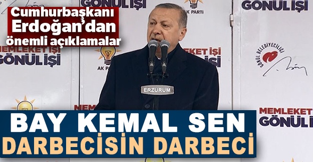 Cumhurbaşkanı Recep Tayyip Erdoğan, İstasyon Meydanı'nda düzenlenen Erzurum mitinginde konuştu. Kar yağışı ve soğuk havaya rağmen alanı dolduran binlerce Erzurumlu Cumhurbaşkanı Erdoğan'a sevgi gösterisinde bulundu. Cumhurbaşkanı Erdoğan, Erzurum Kongresi'nin 100. yıl dönümüne hazırlandıklarını belirterek, "Unutmayın vatan bir bütündür bölünemez. İlkemizi bir asır önce buradan haykırmıştık. Çünkü manda ve himaye yani vesayet kabul edilemez şiarını tüm dünyaya ilan etmiştik. Ama birileri ne diyor? Bölücü örgütün himayesinde olanlar ne diyor? Kürdistan Kuzey Irak'ta çok seviyorlarsa oraya gitsinler. Benim ülkemde Kürdistan diye bir bölge yok. Böyle bir bölünmeye asla müsaade etmedik ve etmeyiz" diye konuştu."Utanç gününün yıldönümü"Erdoğan, "Bugün 28 Şubat. Postmodern darbesinin demokrasimiz adına o utanç gününün yıldönümü. Yani başörtülü kızlarımın üniversitelere alınmadığı bir günün yıl dönümü. Bu çileleri CHP ile çektik. Bu CHP zihniyetidir. Bu camilerimize ahıra çeviren bu CHP zihniyetidir. Başörtülü kızlarımızı odalarda hesaba çeken rektör yardımcısı hanım CHP'nin milletvekili oldu biliyorsunuz. Daha bize ne anlatıyor bunlar. Bizi aldatamazsınız" diye konuştu."Biz bugün Türkiye'nin beka meselesinden bahsettiğimizde bazıları bunu istihza ile karşılıyor" diyen Cumhurbaşkanı Erdoğan, "Biz Türkiye'nin içinden geçtiği dönemin hassasiyetini tüm yönleriyle milletimizle paylaşıyoruz. Türkiye son 6 yıldır çok yönlü saldırıya maruz kaldı. Bunların hiçbiri tesadüf değildi. Hesapsız kitapsız değildi" dedi."Bay Kemal sen darbecisin darbeci"Cumhurbaşkanı Erdoğan konuşmasını söyle sürdürdü:"Bay Kemal sen darbecisin darbeci. Sen darbecilerle berabersin. Geçmişinizde de zaten bu var. Kendinizi aklayamazsınız. Menderes'in ipini çekenlerin zihniyeti neyse sizin zihniyetiniz aynı. İşte şimdi de sen bölücü terör örgütüyle berabersin" diye konuştu."Bugün yokluk kuyruğu yok varlık kuyruğu var"CHP Genel Başkanı Kılıçtaroğlu'nun Batman'da yaptığı konuşmaya değinen Cumhurbaşkanı Erdoğan, "Dün baktım Batman'da konuşuyor. Ne diyor? Domates, biber, patlıcan? Sizin tarihinizde yokluklar kuyruğu vardı bay Kemal. Senin baban da bunu iyi bilir sen de iyi bilirsin. Detayına girmeyeyim. Bugün yokluk kuyruğu yok varlık kuyruğu var. Halkımı sömürmek isteyenlere, simsarlara fırsat vermemek için biz bu adımı attık" diye konuştu.Dadaşlarla buluşmak bize güç veriyorSoğuk havaya rağmen meydanı dolduran Erzurumlulara teşekkür eden Cumhurbaşkanı Erdoğan, "Her fırsatta Dadaşlarla buluşmak bize güç veriyor. Erzurum Asya'nın kapısı, Türkiye'nin tapusu Erzurum. Erzurum medeniyetimizin tarihimin medarı iftiharı Erzurum. Her oğlu Alparslan her kızı Nene Hatun Erzurum. Erzurum Selçuklu'nun, Osmanlı'nın, cumhuriyetin gözbebeği Erzurum. Erzurum mücadelesiyle, tarihimizi yazan türküleriyle, kültürümüzü yaşatan gönül tellerimizi titreten Erzurum. Erzurum kilidi mülki İslam'ın Erzurum. Mevla'ya emanet olsun Erzurum. Bir aylık bir aranın ardından bugün sizleri kar ve tipi altında gönülden selamlıyorum. Milli mücadelemizin ateşi Erzurum'da yakılmıştır. Erzurum Kongresi'nde ne denilmişse Kurtuluş Savaşı'nda o yapılmıştır. 100. yıldönümüne hazırlanıyoruz. İlkemizi bir asır önce buradan haykırmıştık. Manda ve himaye yani vesayet kabul edilemez ilkesini tüm dünyaya ilan etmiştik" dedi."Kişi sevdikleriyle beraberdir""Kişi sevdiğiyle beraberdir" Hadisi Şerifini hatırlatan Cumhurbaşkanı Erdoğan, "Kim kimle kol kola. CHP, HDP sözde İYİ Parti ve ne yazık ki Saadet Partisi. Dördü bir araya gelmişler. Kişi sevdikleriyle beraberdir. Söyle bana arkadaşını söyleyeyim sana kim olduğunu. Ya huyundan ya suyundan ya dilinden kapacak. CHP ile kol kola olan ne olacak? Onlar gibi olacak. Aynı şekilde İYİ Parti'yle, aynı şekilde HDP'yle. Bizim ittifakımızın adı Cumhur İttifakı. Nerede başladı? 15 Temmuz'da başladı. Yenikapı ruhuyla yürüyor. Pazara kadar değil mezara kadar. Erzurum 31 Mart'ta istikrarımıza, istiklalimize, istikbalimize göz dikenlere bir kez daha derslerini veriyor muyuz? 31 Mart'ta bir kez daha milli iradeye sahip çıkıyor muyuz? 31 Mart'ta bir kez daha tevazu samimiyet ve gayretle memleket işi gönül işi diyor muyuz? Gönül belediyeciliği diyor muyuz? Büyükşehir ve tüm ilçelerde Cumhur İttifakı ve AK Parti'li MHP'li adaylarımıza sahip çıkıyor muyuz? Maşallah. Kar boran fırtına benim Dadaşlarımı engellemiyor. İşte yine meydandasınız. Teşekküre geldiğimde inşallah temennim hava daha güzel olur" dedi.Bugüne kadar Erzurum'a 24 katrilyon lira yatırım yaptıklarını kaydeden Cumhurbaşkanı Erdoğan, "110 bin metrekarelik alanda Yakutiye bölgesinde millet bahçesi yapıyoruz. Bin 500 metrekarelik bir de millet kıraathanesi yapacağız. Bin 200 yataklı Erzurum şehir hastanesini de inşallah kuruyoruz. Erzurum şehir hastanesi konforuyla tanışacak. Erzurum'u asla ihmal etmedik etmeyeceğiz. Erzurum'da 10 bin konut projesini tamamladık, hak sahiplerine teslim ettik. Ulaşımda 49 kilometre bölünmüş yolu 557 kilometreye çıkardık. Biz Ferhat'ız sizde şirin. Ferhat'ı Şirin'le kavuşturduk. Erzurum kent içi trafiğini rahatlatmak için tramvay için çalışmalara başladık" diye konuştu."Sen İzmir'e su veremiyordun"Erdoğan, "Bay kemal ne diyor, Ankara'da, İstanbul'da eğer biz belediyeleri alırsak suyu ucuzlatacağız diyor. İzmir sendeydi İzmir'de suyu ucuzlattın mı? Muğla sendeydi suyu ucuzlattın mı? Sen İzmir'e su veremiyordun. DSİ devreye girdi İzmir'e su verdik. Hastanelerle ilgili söylediği yalanlar. SSK Genel Müdürüyken bunlar ölüleri rehin aldılar. Önümüzdeki dönem Erzurum'u inşallah daha büyük hizmetlerle buluşt