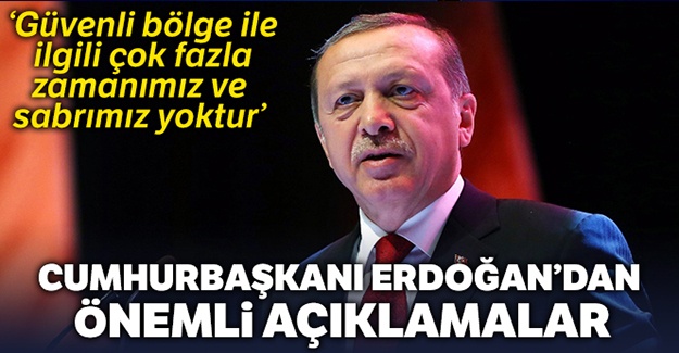 Cumhurbaşkanı Erdoğan:”Fırat’ın doğusundaki tüm sınırlarımızda kurulacak güvenli bölge ile ilgili çok fazla zamanımız ve sabrımız yoktur" dedi.